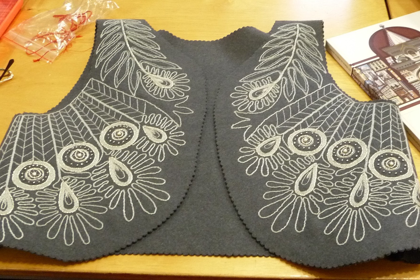 Для вдохновения ученицам продемонстрировали жилет из шерсти с ажурным орнаментом, выполненном в технике золотного шитья, а также рассказали о возможности применения традиционной вышивки золотыми, серебряными или шёлковыми шнурами, жемчугом, бисером, канителью при изготовлении современных изделий на примере коллекции одежды, созданной по мотивам орнаментов из альбома О.Г. Обертас «Решётки Владивостока».