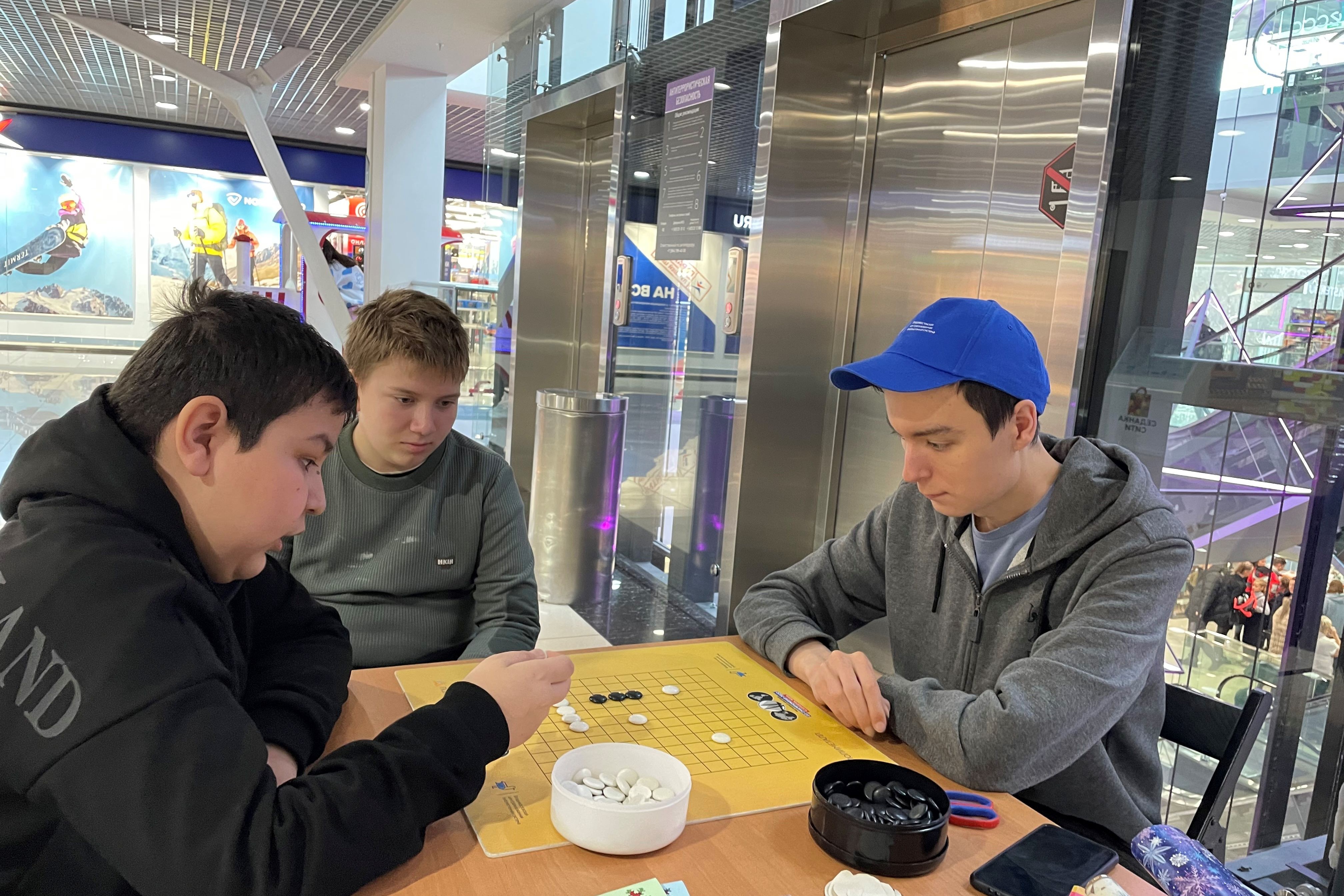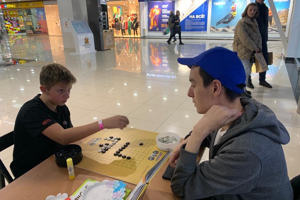 Других ребят привлекла логическая настольная игра Го. Интересно было познакомиться с правилами игры, а ещё и поиграть удалось. Кто-то услышал о ней впервые и получил исчерпывающую информацию, в каких библиотеках города можно этим серьезно заняться. Девочки тоже не отказывались поговорить о книге, чтении и библиотеках, с удовольствием фотографировались с гуляющим по торговому центру «белым медведем» и на фоне библиотечной площадки.
