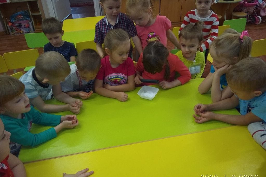 Для исследования в группу был принесён снежок и лупа. Сначала все дети по очереди рассматривали через лупу снежинки. Снег, который под действием тёплого воздуха вскоре растаял, и дети могли убедиться, что снег при таянии превращается в воду с осадком в виде тёмных соринок. Каждый ребёнок мог через лупу и их разглядеть. Было обращено внимание детей на то, что талой водой мы можем поливать растения, но пить талую воду и есть снег нельзя. Также снег важен для деревьев и растений, так как он укрывает их и защищает от морозов.