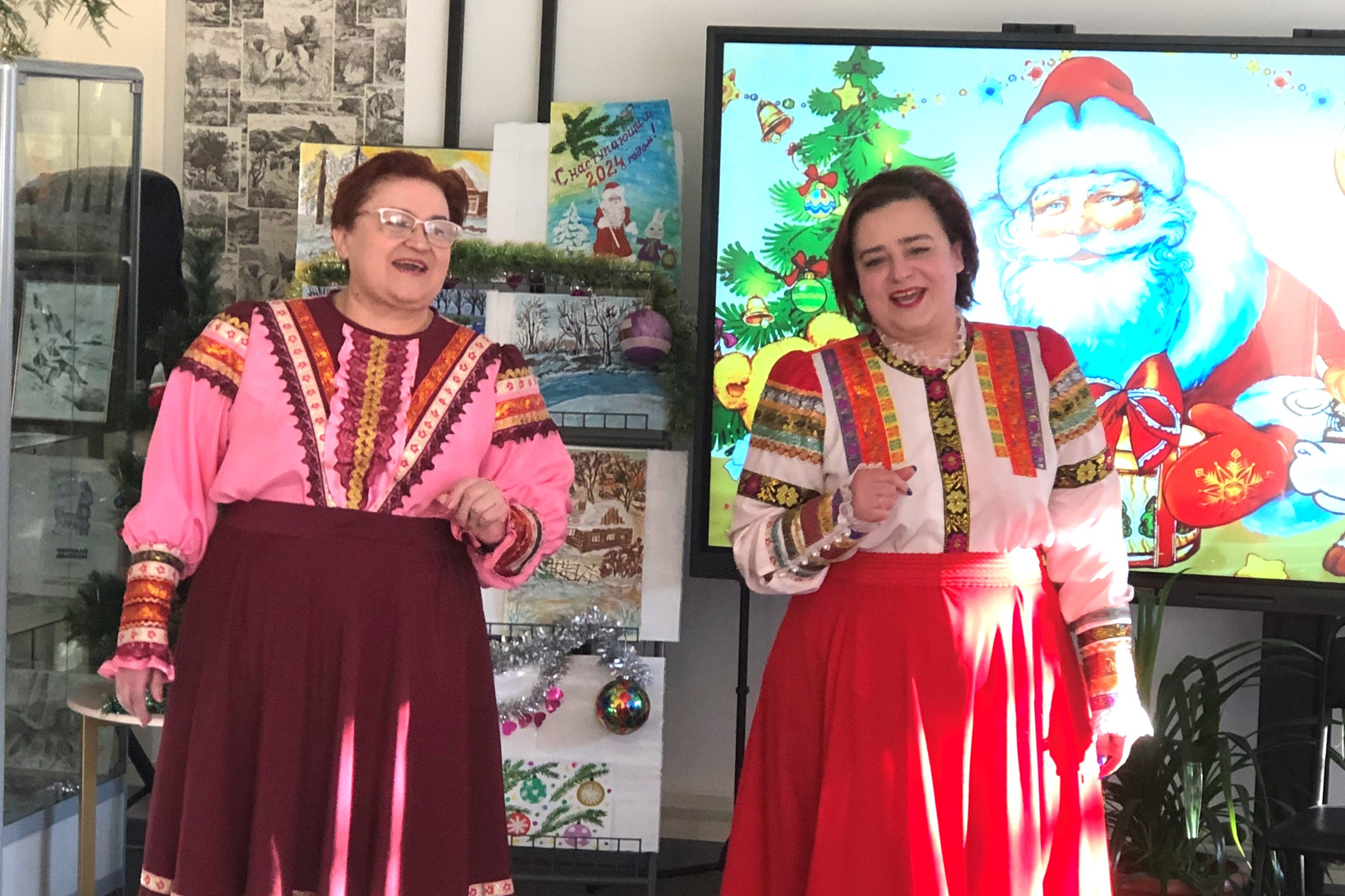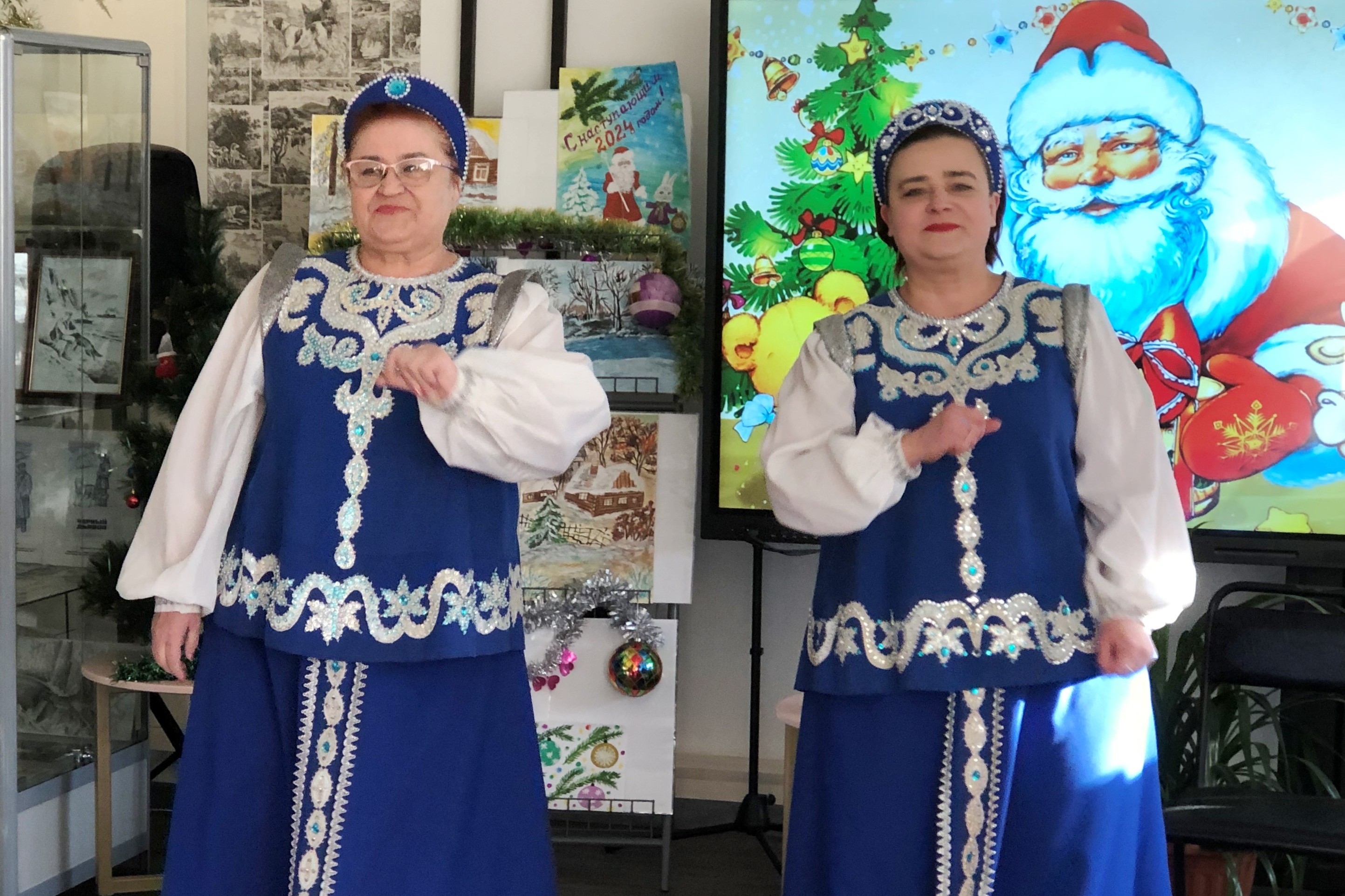 Программу продолжил дуэт «Вольница» Людмила и Елена Сердюк. Своими замечательными голосами, красивыми народными костюмами они сразу очаровали зал. Попурри из народных песен «Русская метелица», «Снега России» и другие известные песни звучали одна за другой. Закружился хоровод, запел весь зал. Подготовил свою новогоднюю программу и Анатолий Сысоев – давний участник встреч в библиотеке. Его редкий по тембру тенор по достоинству оценили слушатели, а репертуар из эстрадных песен всегда располагает к танцевальным фантазиям. Каждый в этот вечер проявил себя творчески, даже те, кто обычно предпочитал оставаться «просто слушателем».