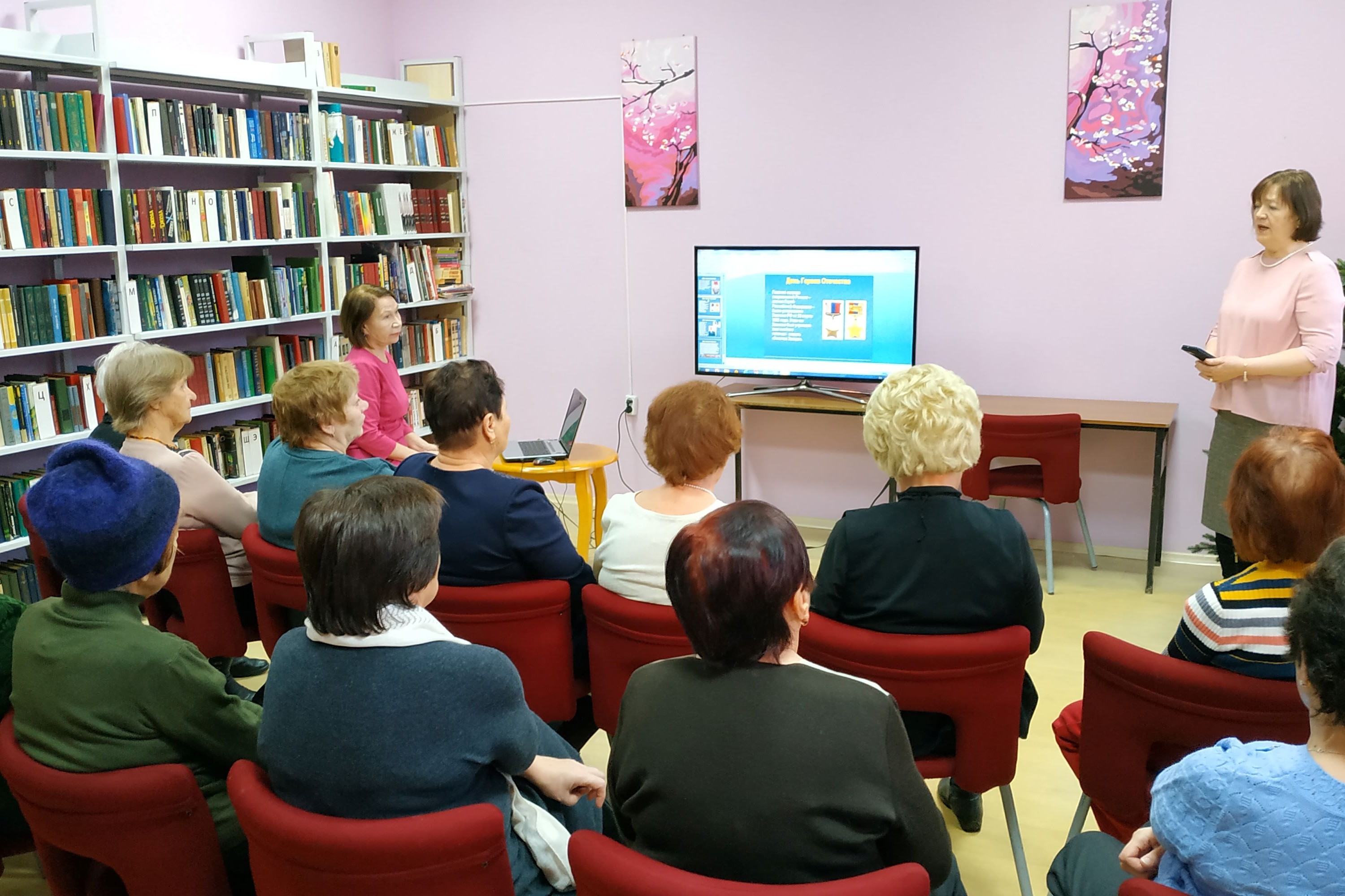 В первой декаде декабря в библиотеке № 13 в клубе по интересам «От сердца к сердцу» прошел литературно-музыкальный вечер, посвященный Героям Отечества. Участники клуба просмотрели презентацию об ордене Святого Георгия, познакомились с наградами выдававшиеся не только за военные подвиги, но и за выдающиеся достижения при освоении космического пространства, новой авиационной техники, особые заслуги перед государством и народом. Читали стихи Эдуарда Асадова, Мусы Джалиля, Булата Окуджавы, Расула Гамзатова.