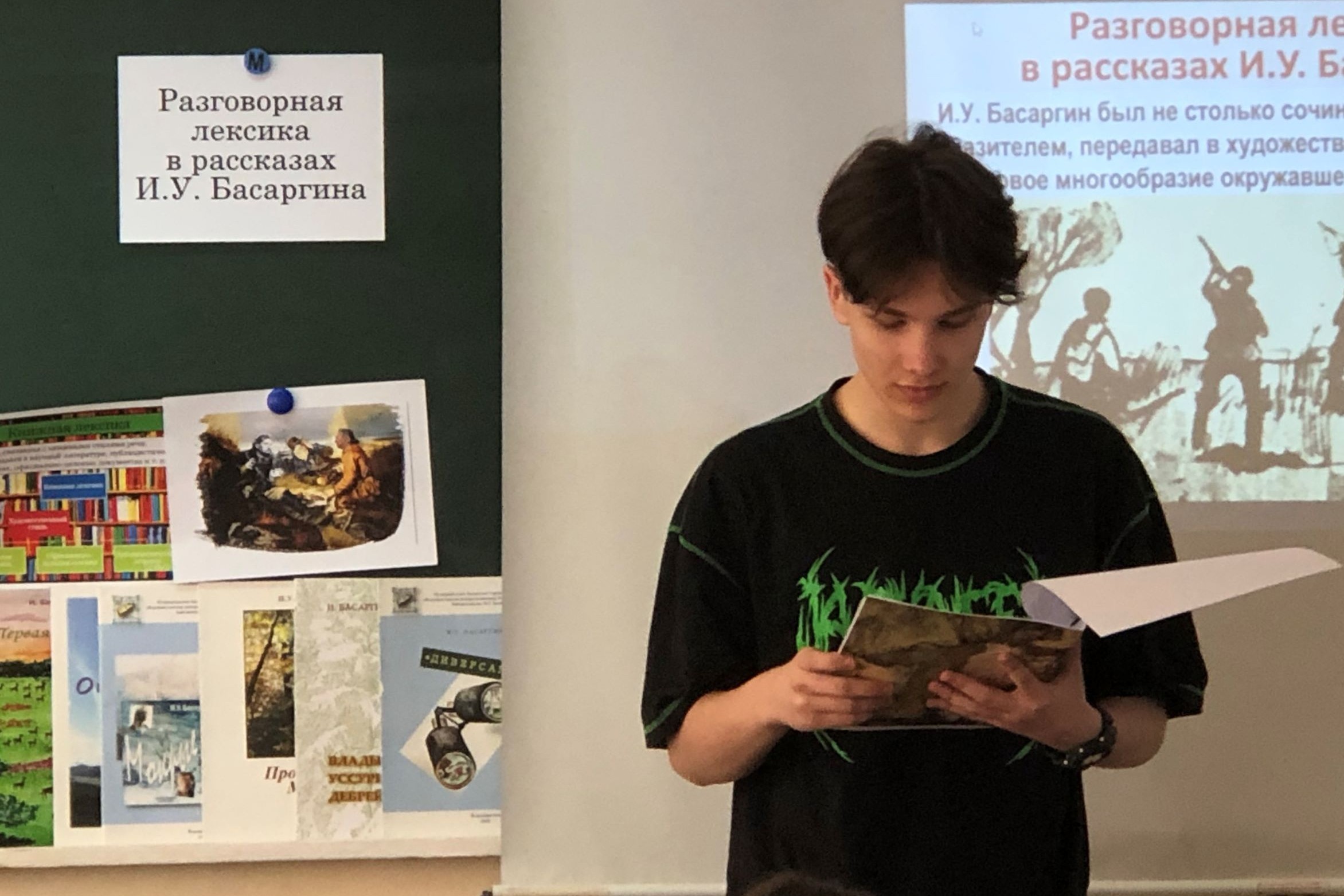 Далее, в ходе беседы, отметили, что язык произведений самобытного приморского писателя И.У. Басаргина особенный, ведь он достался ему от его предков – таежников, которые переселились на Дальний Восток во второй половине XIX века; обратили внимание на разговорные слова в рассказах, написанных на основе автобиографических материалов.