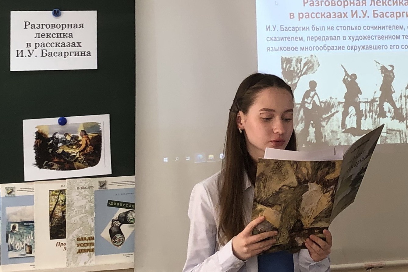 Далее, в ходе беседы, отметили, что язык произведений самобытного приморского писателя И.У. Басаргина особенный, ведь он достался ему от его предков – таежников, которые переселились на Дальний Восток во второй половине XIX века; обратили внимание на разговорные слова в рассказах, написанных на основе автобиографических материалов.