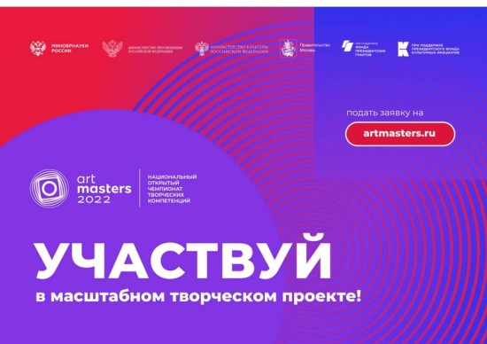 Департамент государственной молодежной политики и воспитательной деятельности Минобрнауки России в рамках реализации федерального проекта «Социальные лифты для каждого» национального проекта «Образование» Минобрнауки России совместно с АНО «Национальный открытый чемпионат творческих компетенций «АртМастерс (мастера искусств)» реализует ежегодный Национальный открытый чемпионат творческих компетенций «ArtMasters».