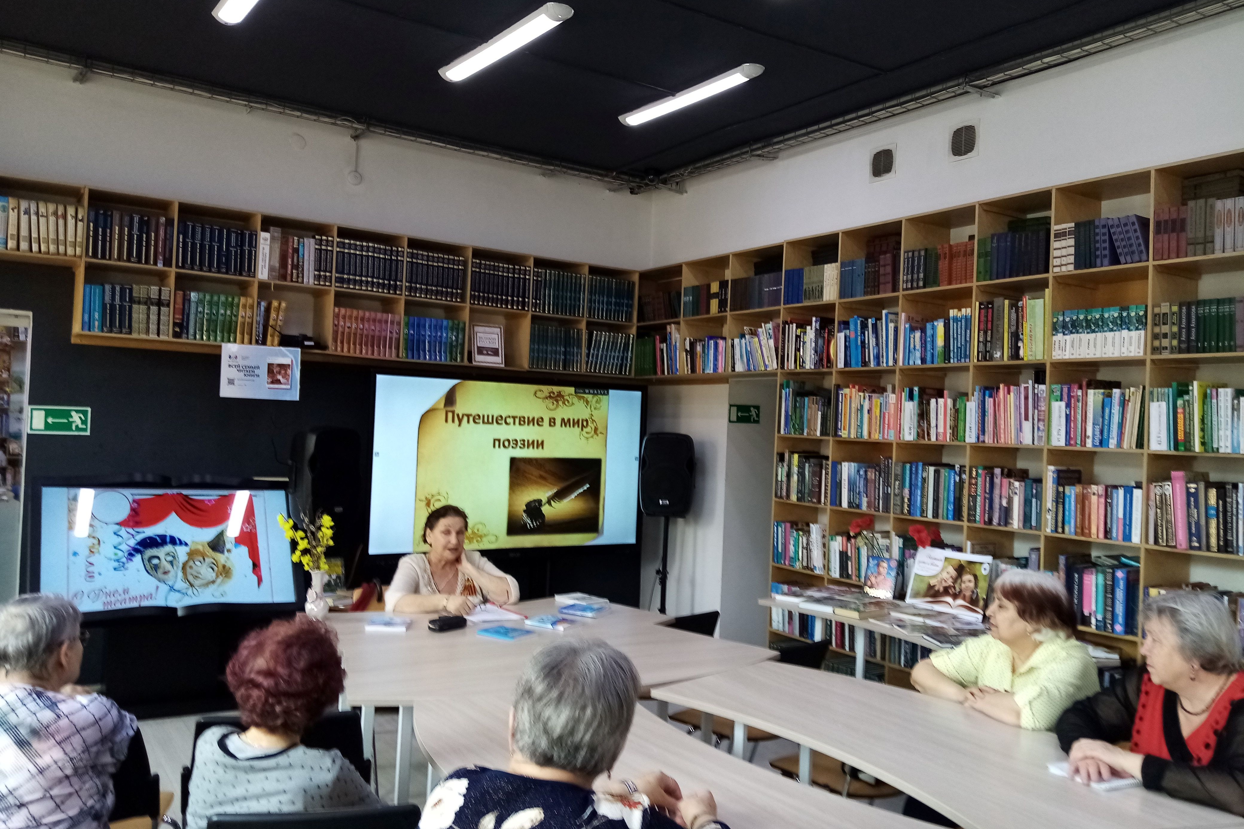 27 марта в библиотеке № 12 для членов клубного объединения «Люди пожилые, сердцем молодые» прошел час искусства. Сотрудники библиотеки подготовили художественный экскурс в историю театра, рассказав о людях, чьи имена вписаны в золотой список Мельпомены: Федоре Волкове, Герасиме Лебедеве, Юрии Любимове, Викторе Розове, сделали обзор литературы, посвященной театру, прогулялись по театральным местам нашего города. Одним из праздников, который отмечали в библиотеке стал День поэзии. В библиотеке стихи звучали в исполнении Денисенко Татьяны Дмитриевны. Она читала свои стихи о Родине, о весне, о любви. С особым волнением прозвучали стихи о защитниках Отечества. Для гостей читали свои стихи и члены клубного объединения: Ильичева Ирина Борисовна и Осипенко Анна Михайловна. Душевные строки, идущие от сердца, никого не оставили равнодушными.