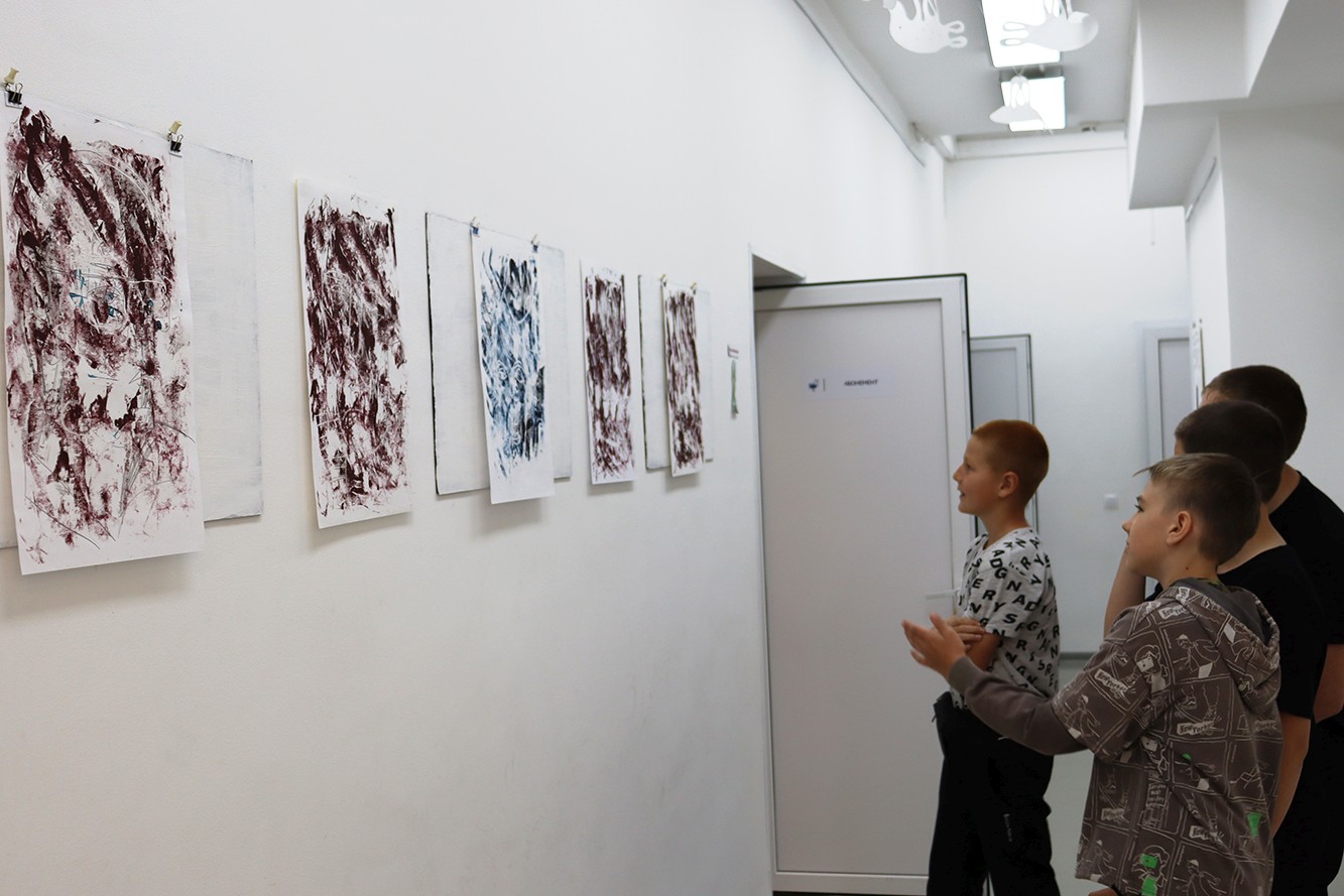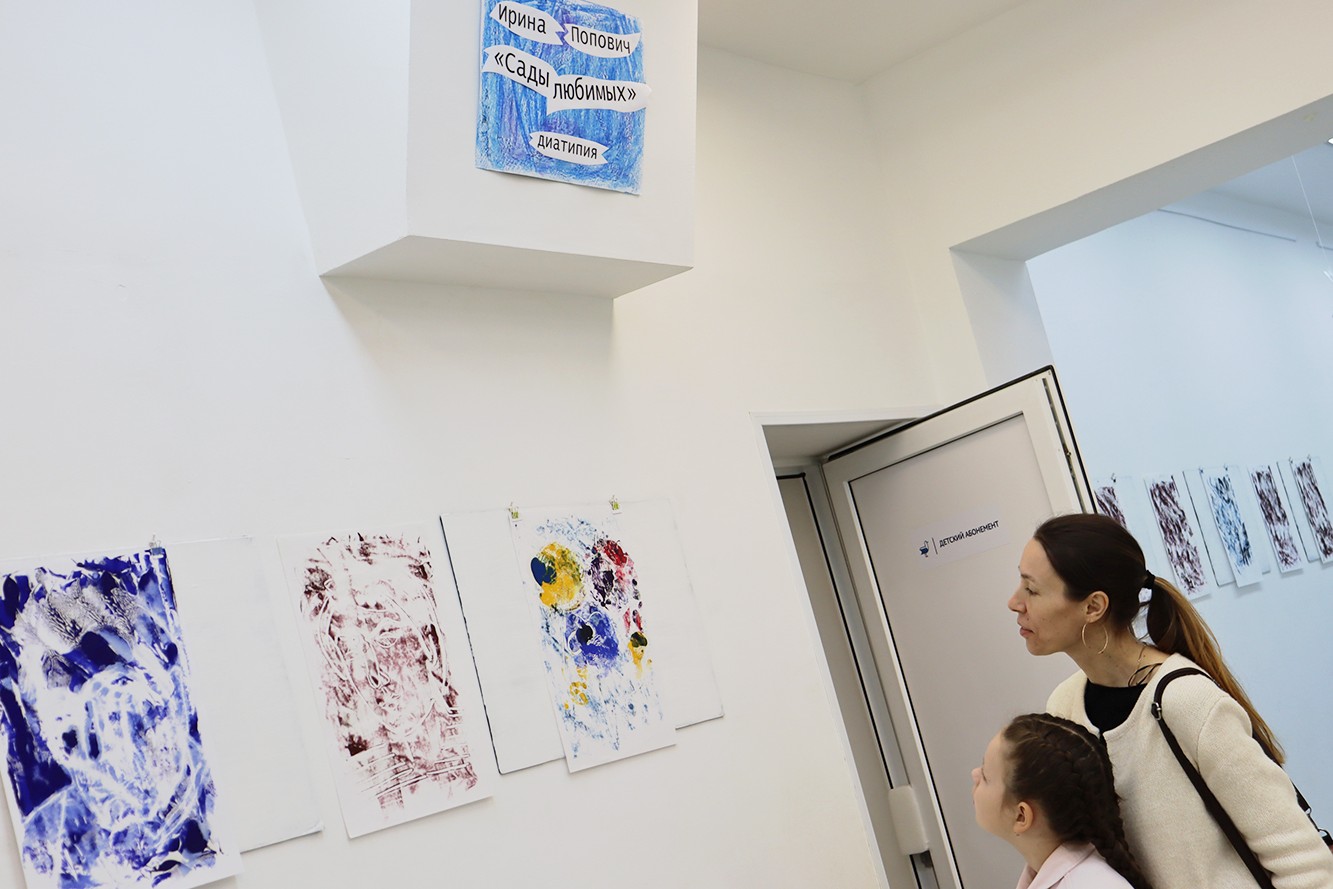 Смена экспозиций в музеях и галереях города проходит за закрытыми дверями, а вот посетители библиотеки № 8 вполне могут стать наблюдателями развески. Выставочное пространство в библиотеке небольшое, компактное, снять одну выставку и развесить другую можно за несколько часов, включая все раздумья над тем, куда какую работу определить и чем дополнить выставку. Серия диатипий «Сады любимых» Ирины Попович возвращается к хозяйке, жаль расставаться этой выставкой, потому что первое время около работ можно было почувствовать чудесный запах масляной краски. Стоит сказать, что детвора в библиотеке сначала с недоверием отнеслась к абстрактным на первый взгляд работам этой выставки, но после объяснений о том, что на них можно увидеть, если присмотреться, дети восприняли это как игру. Синие и темно-красные пятна и линии превратились как по волшебству в задумчивые лица, мелькающие среди вечерней листвы.