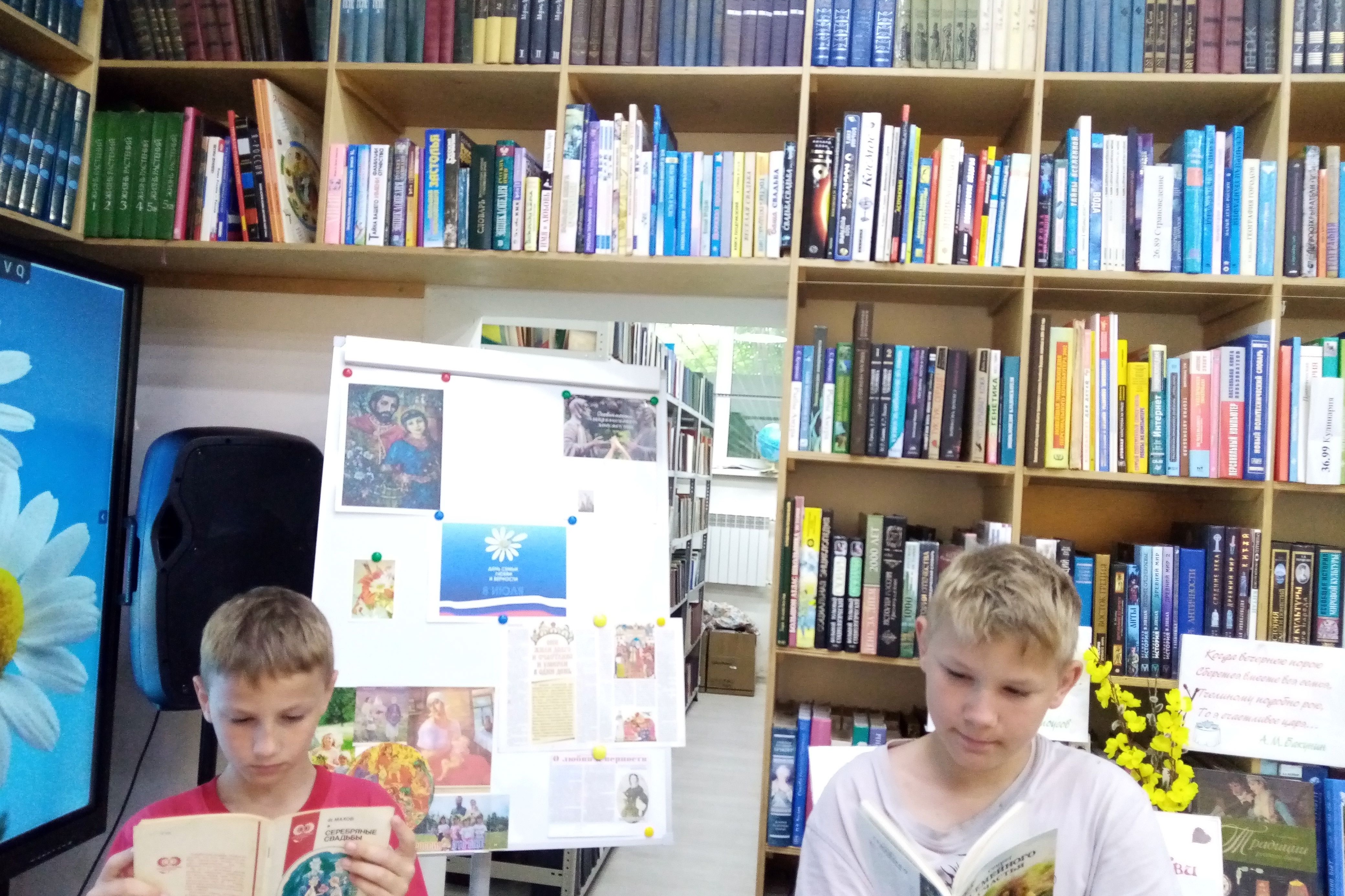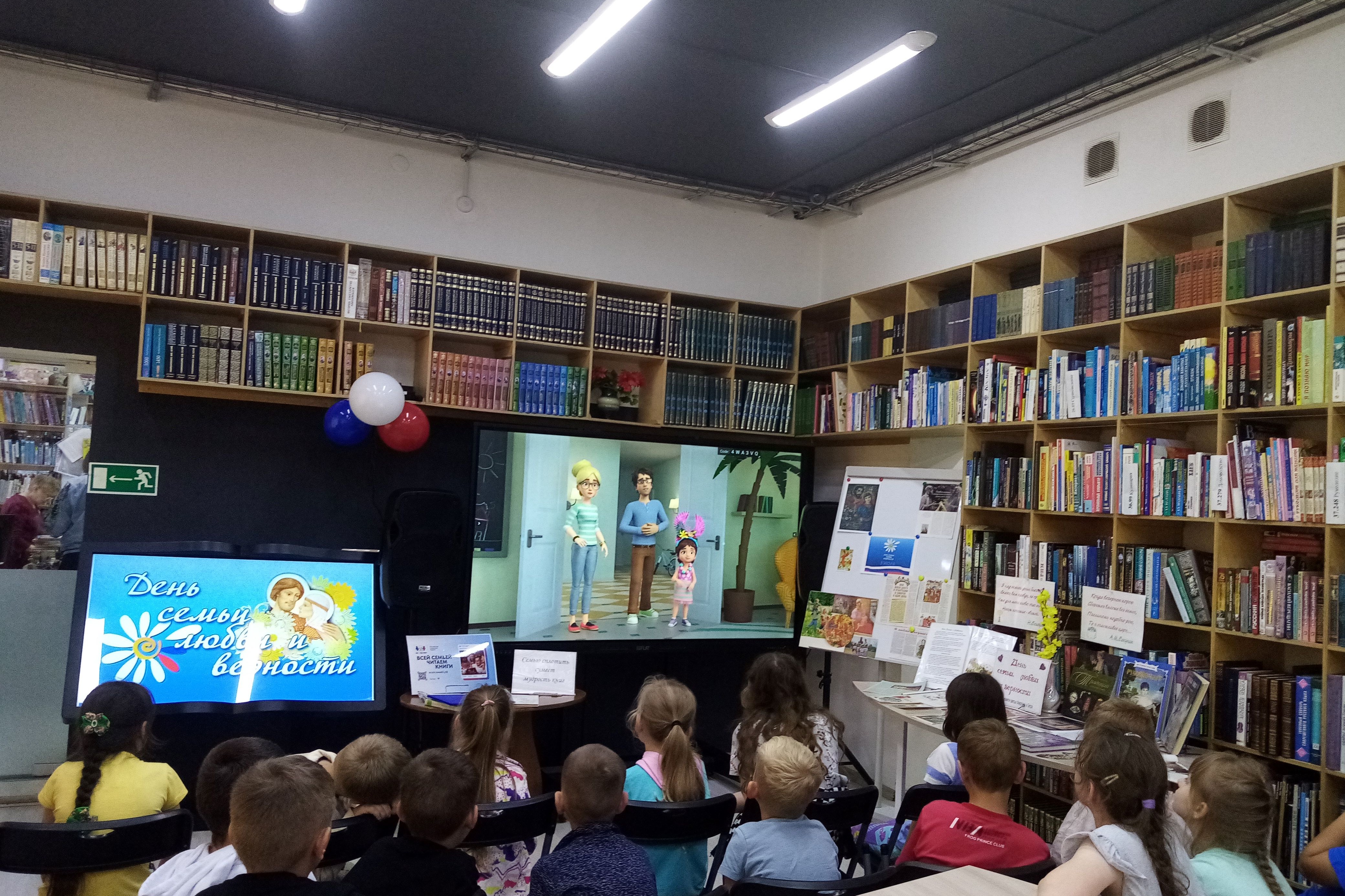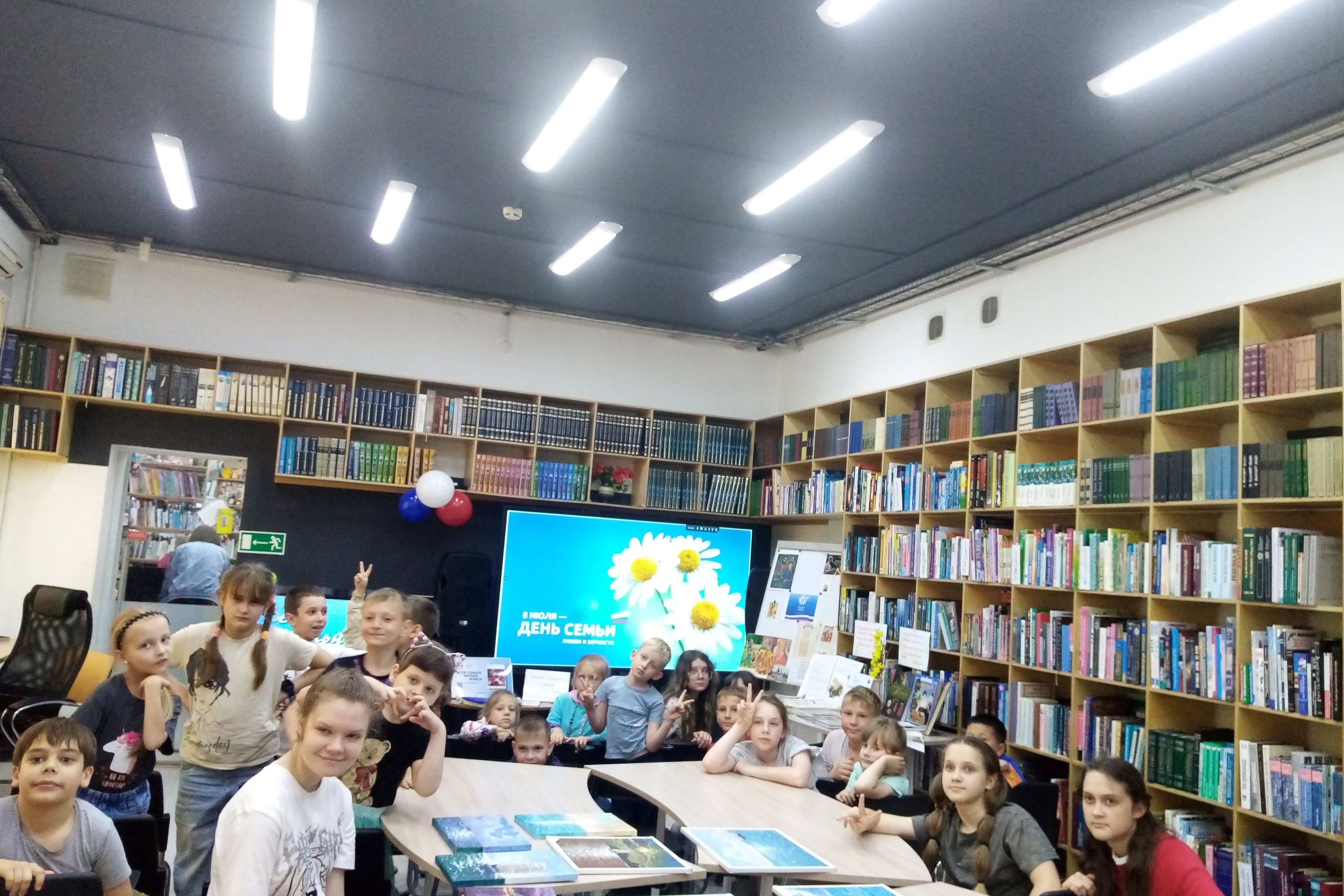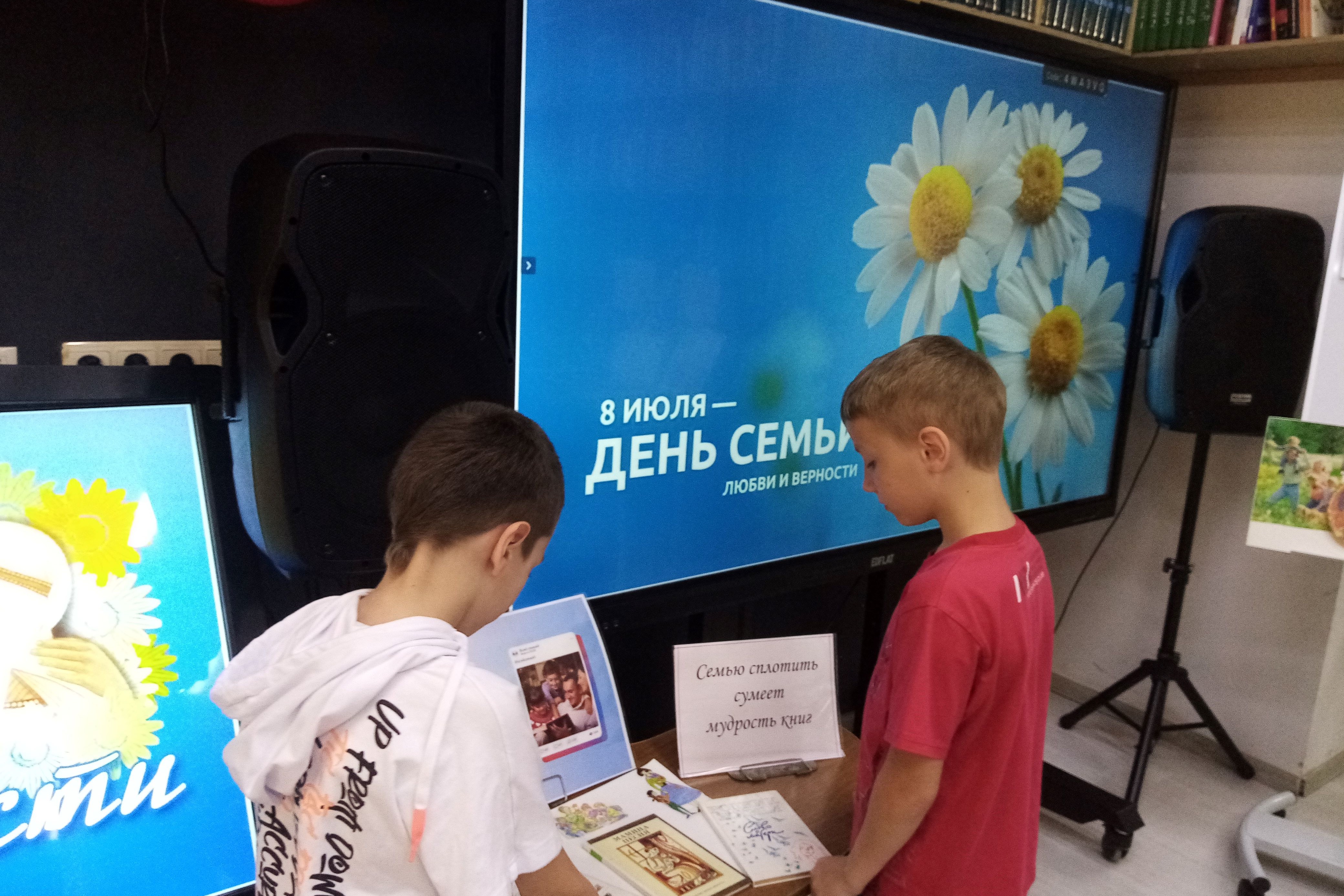 Ребята участвовали в викторине «О семье по русским народным сказкам», в конкурсе «Закончи фразу», отгадывали загадки, рассказывали о семейных отношениях. Дети вспомнили пословицы, поговорки и стихотворения о ромашке и семье. К празднику была подготовлена книжная выставка «Любовь и верность – два крыла семьи», где были представлены книги о празднике, о роли семьи, о построении семейных отношений и о воспитании детей.