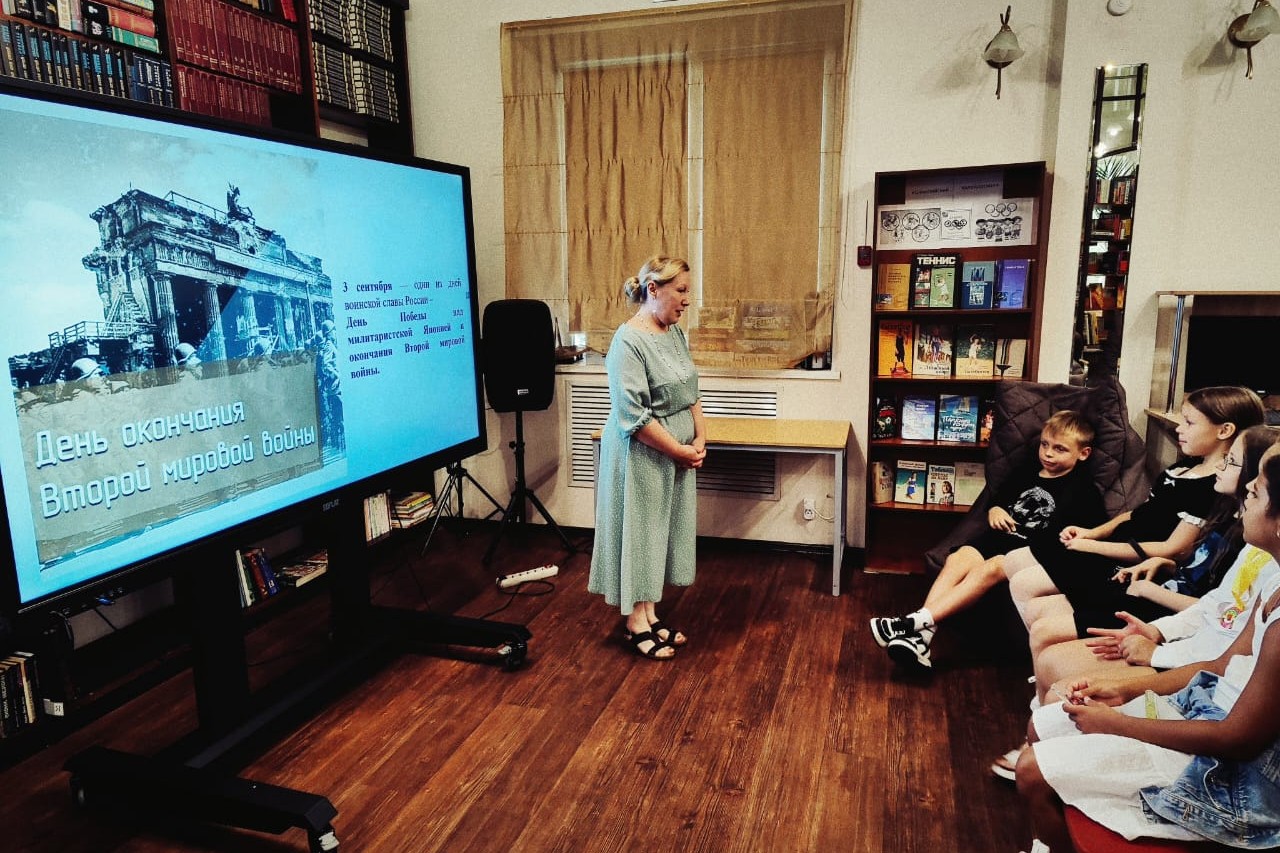 Библиотека подготовила презентацию ко дню воинской славы России – Дню Победы над милитаристской Японией и окончанию Второй мировой войны. Школьникам рассказали об истории этого праздника, а также познакомили с литературой о тех трагических событиях. Вторая мировая война, длившаяся 6 лет, была самой разрушительной и кровопролитной из войн. В ней погибло свыше 55 миллионов человек.
