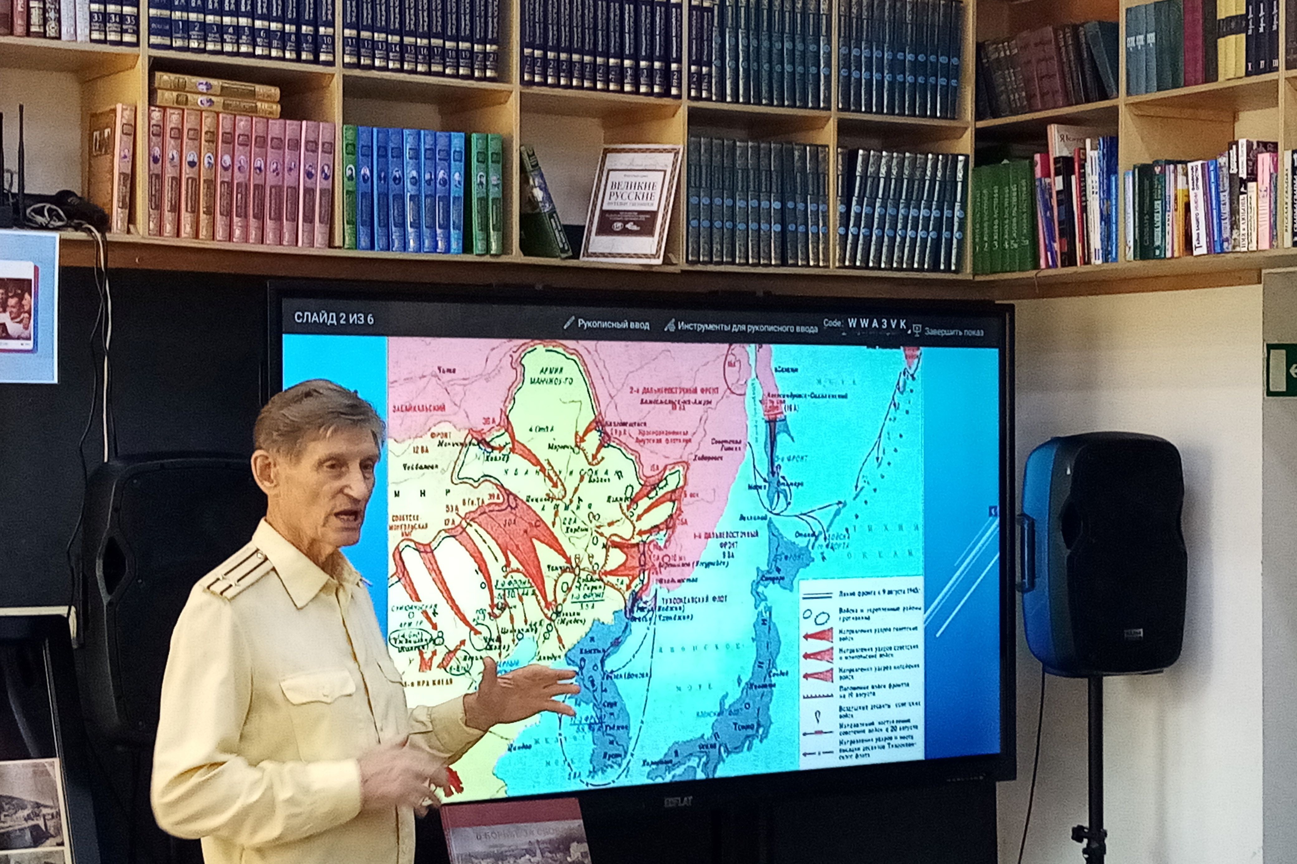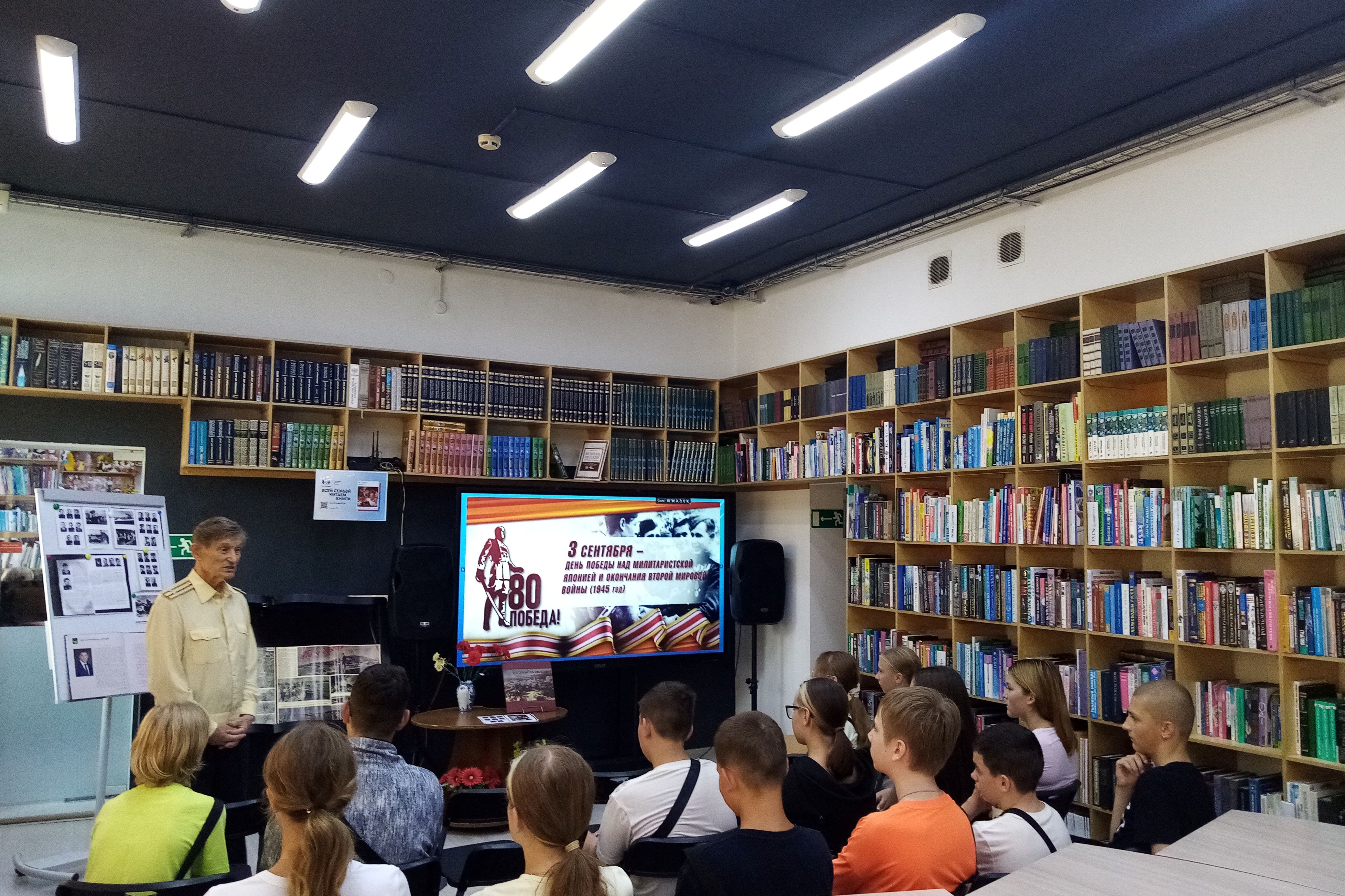 Ветеран Вооруженных сил, капитан второго ранга Малиновский Виктор Борисович подробно остановился на боевых действиях советских войск против Квантунской армии, освобождение от японских захватчиков Северно-Восточного Китая (Маньчжурии), Северной Кореи, Южного Сахалина и Курильских островов. Война с Японией стала примером мужества и героизма советского солдата. Самая кровавая война в истории человечества закончилась здесь, на Дальнем Востоке. Также школьники познакомились и с интересом рассмотрели книги, представленные на выставке.