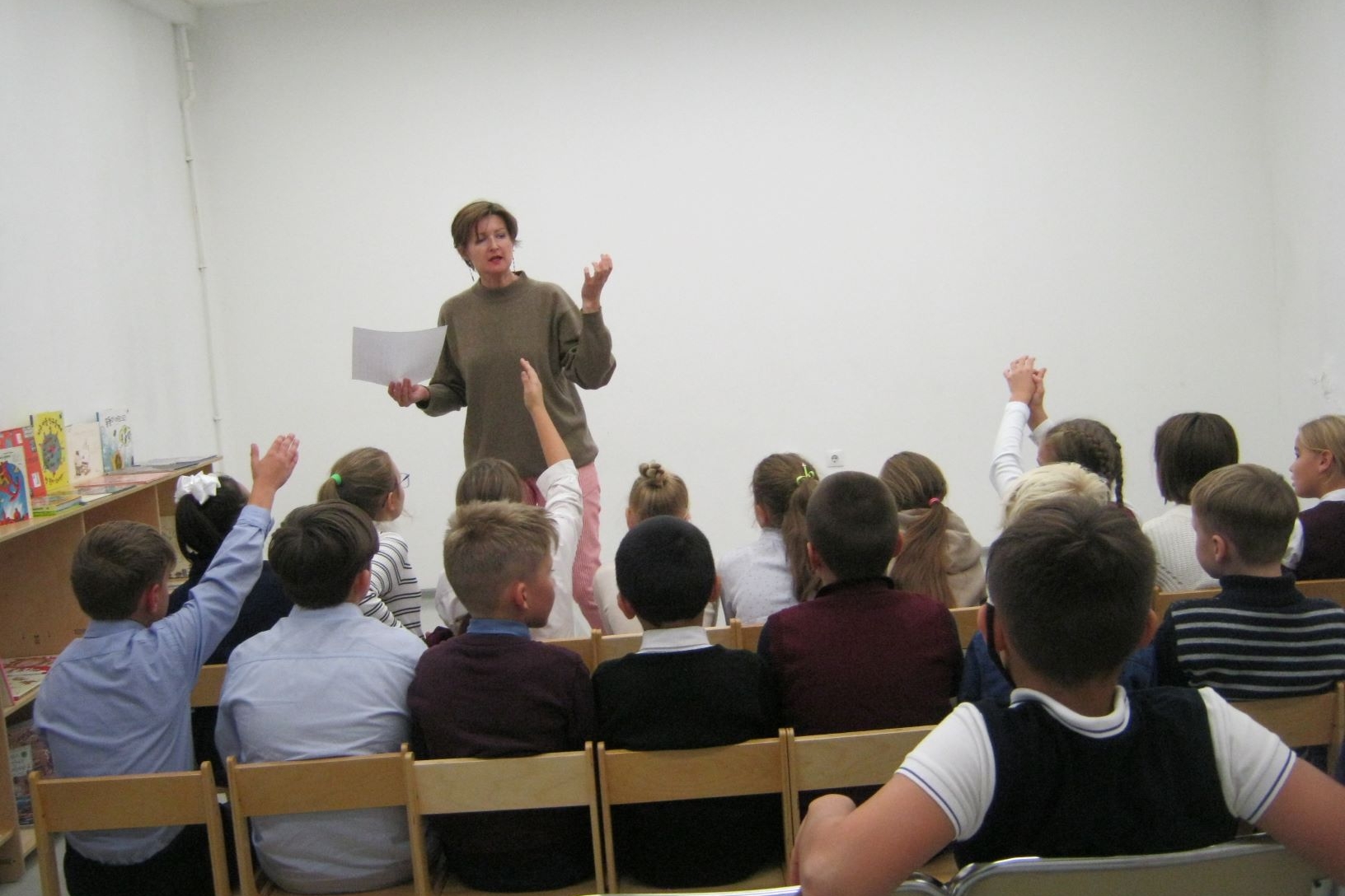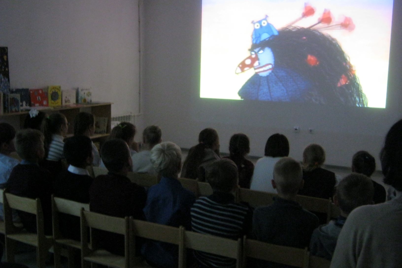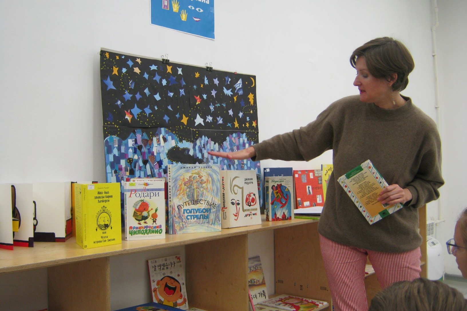 Попробовал 4 «Б» и выполнить такое же упражнение для развития фантазии, какое давал своим ученикам юный Джанни Родари, когда был учителем в школе. Двое четвероклассников назвали первое пришедшее в голову слово, это были «машина» и «зал». И класс стал думать, как можно связать в одну историю машину и зал. Машина почему-то сразу была определена синего цвета и большая, не потому ли, что под носом у школьников среди прочих книг Родари стояло, возвышаясь, симпатично иллюстрированное «Путешествие Голубой стрелы» — поздняя повесть писателя.