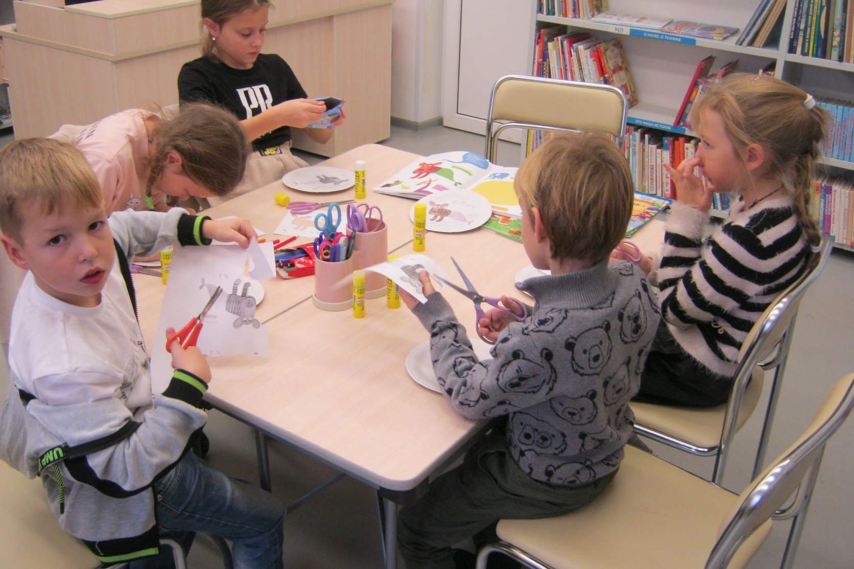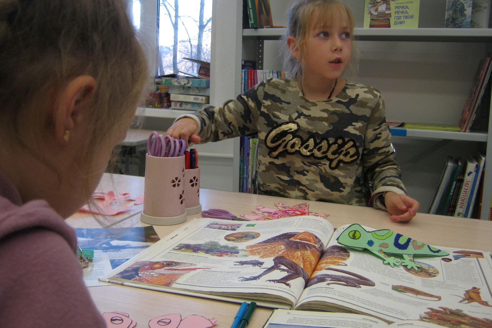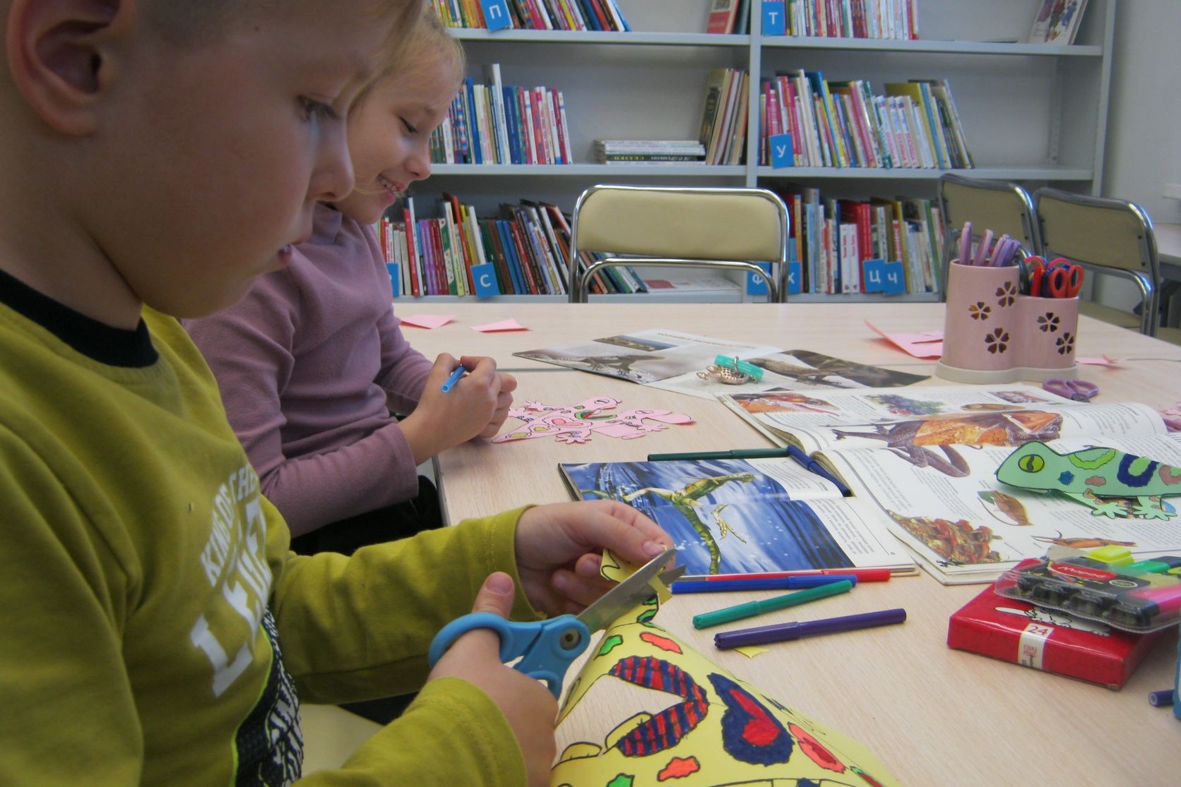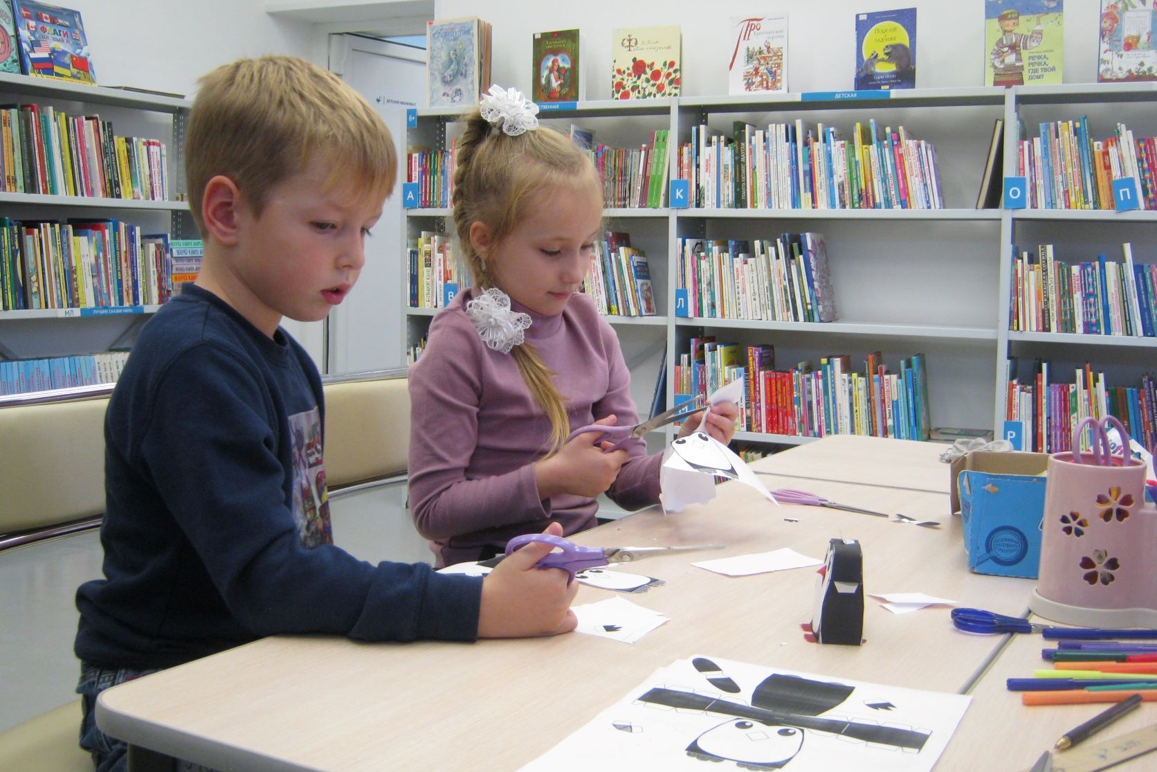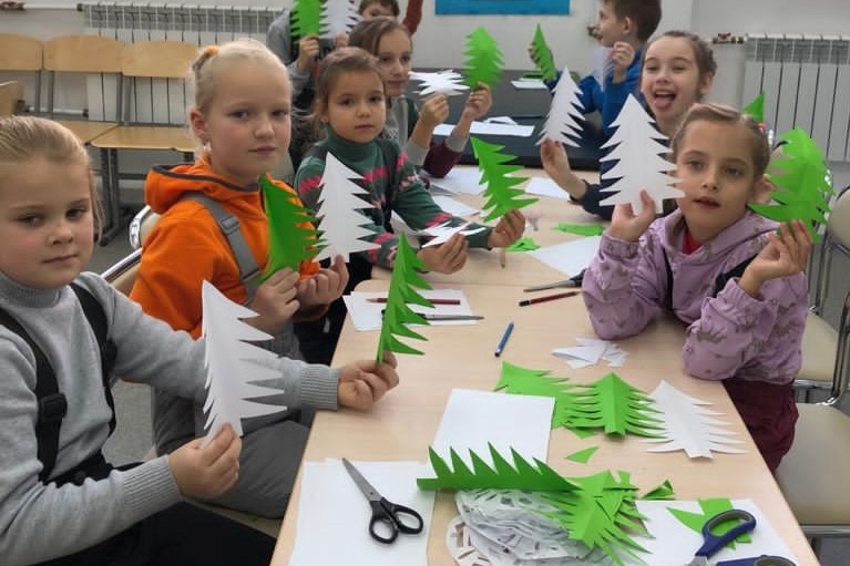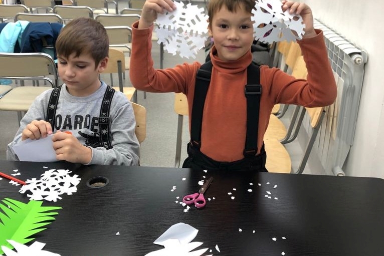 В библиотеке № 2 ребята из группы продленного дня «Деткам Просто» делали снежинки и елочки из зеленой бумаги для украшения библиотеки к празднику. Ребят научили складывать особым образом листки бумаги. Они аккуратно и терпеливо вырезали разнообразные снежинки, активно проявляли фантазию и придумывали свои узоры, с интересом учились тому, как из обычной бумаги, своими руками, создавать новогоднее настроение.