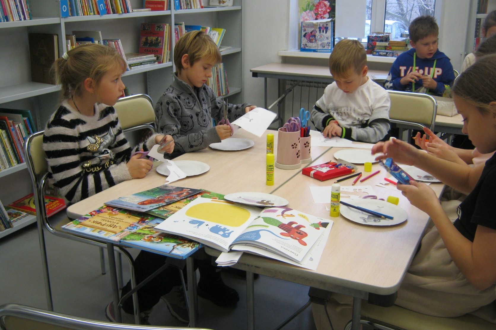 В библиотеке №8 продолжаются еженедельные занятия творческой мастерской по вторникам. Во второй половине ноября на детский абонемент прибыла коллекция «Библиотека Деда Мороза», и эти книги на пару месяцев будут в распоряжении читателей. Поэтому на творческих мастерских кое-что поменялось, на смену любимой детьми бумагопластике пришел период предпраздничных поделок. Открыла этот период бумажная тарелочка с изображением тигрокарпа из книги Леонида Шмелькова «ЫБА! Море». Поделка эта совсем простенькая, но иногда хочется не вырезать, сгибать и клеить, а просто раскрашивать что-нибудь цветными карандашами.