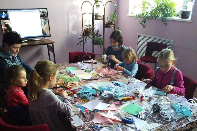 В творческой части занятия для изготовления были предложены 2 вида объемных снежинок. Самую простую из них – снежинку-цветок — выполнили все, но особенно она понравилась ребятам помладше, они сделали для украшения библиотеки еще по одной такой снежинке.