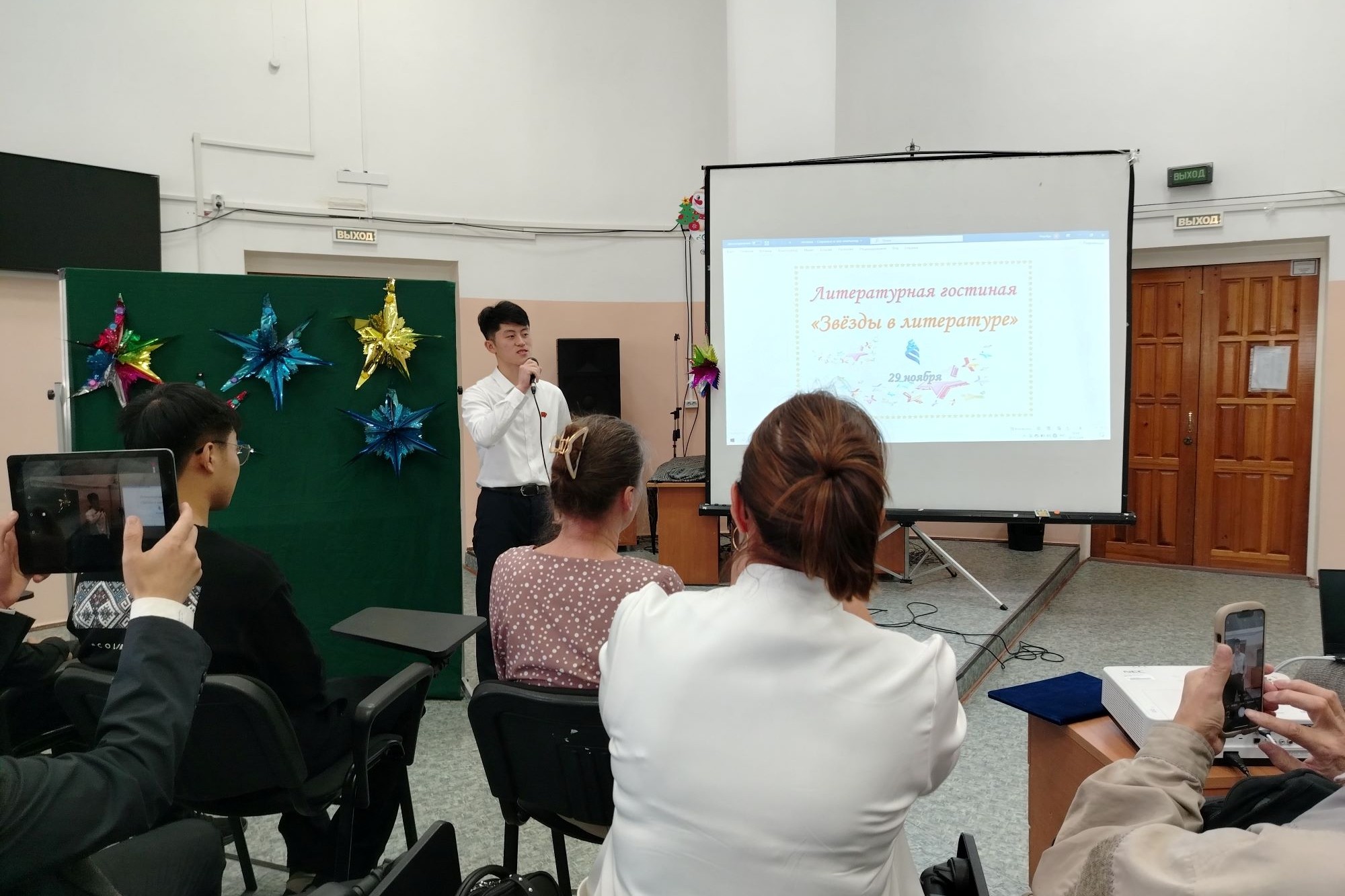 29 ноября в Центре русского языка и культуры прошла литературная гостиная «Звезды в литературе», организованная педагогом дополнительного образования Центра Натальей Николаевной Скидан, гостем и участником которой стала библиотека № 21. В большой светлой аудитории, заполненной благодарной отзывчивой публикой из разных углов земного шара, выступили со стихотворениями русских поэтов иностранные слушатели из Китая, Северной Кореи, Монголии и даже Уганды.