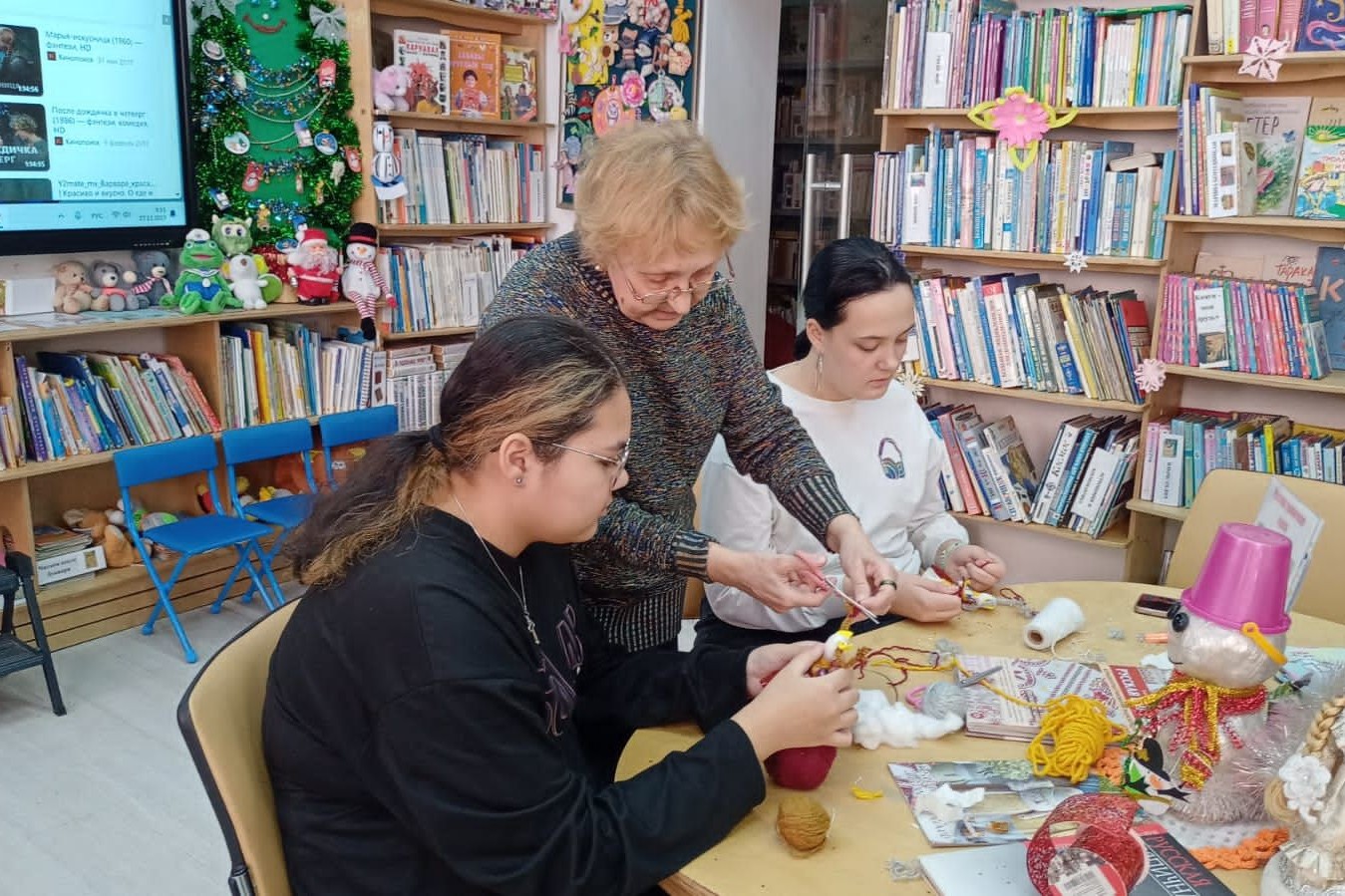 На занятиях по народной кукле слушали интересные истории про тряпичную куклу козу. Дело в том, что много веков эту куклу мастерили наши прабабушки именно к Рождеству. Она так и называется — Рождественская коза. В разных губерниях ее делали по-своему. Одни умельцы мастерили ее из дерева, украшая лентами, другие — из лыка, третьи — из кусочков ткани. Вот девочки постарше в эти предновогодние дни мастерили ее в библиотеке.