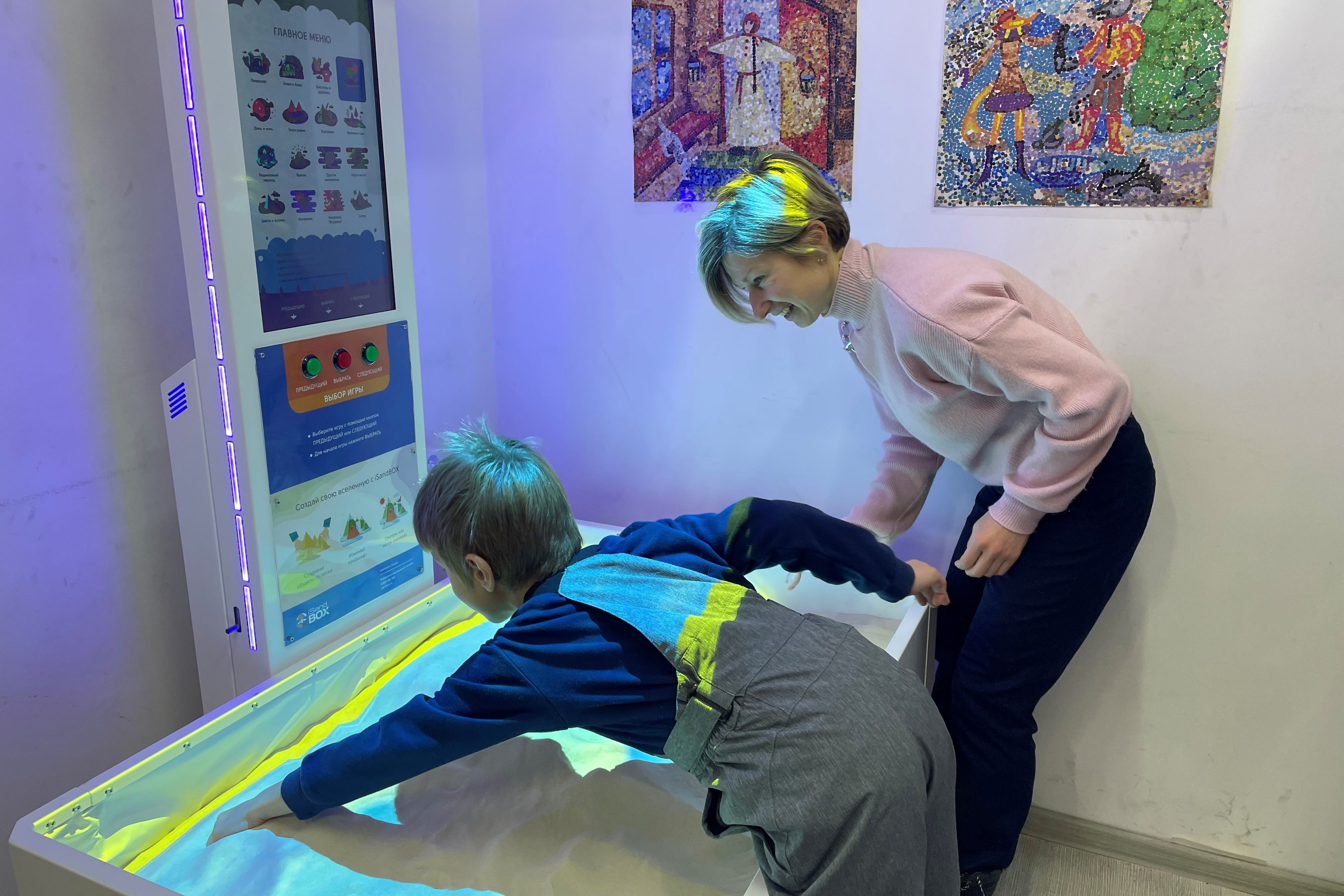 Еще большим успехом пользовались игры в интерактивной песочнице, даже родители с удовольствием присоединились к детям, ведь много интересного и полезного можно было узнать, играя в ней.