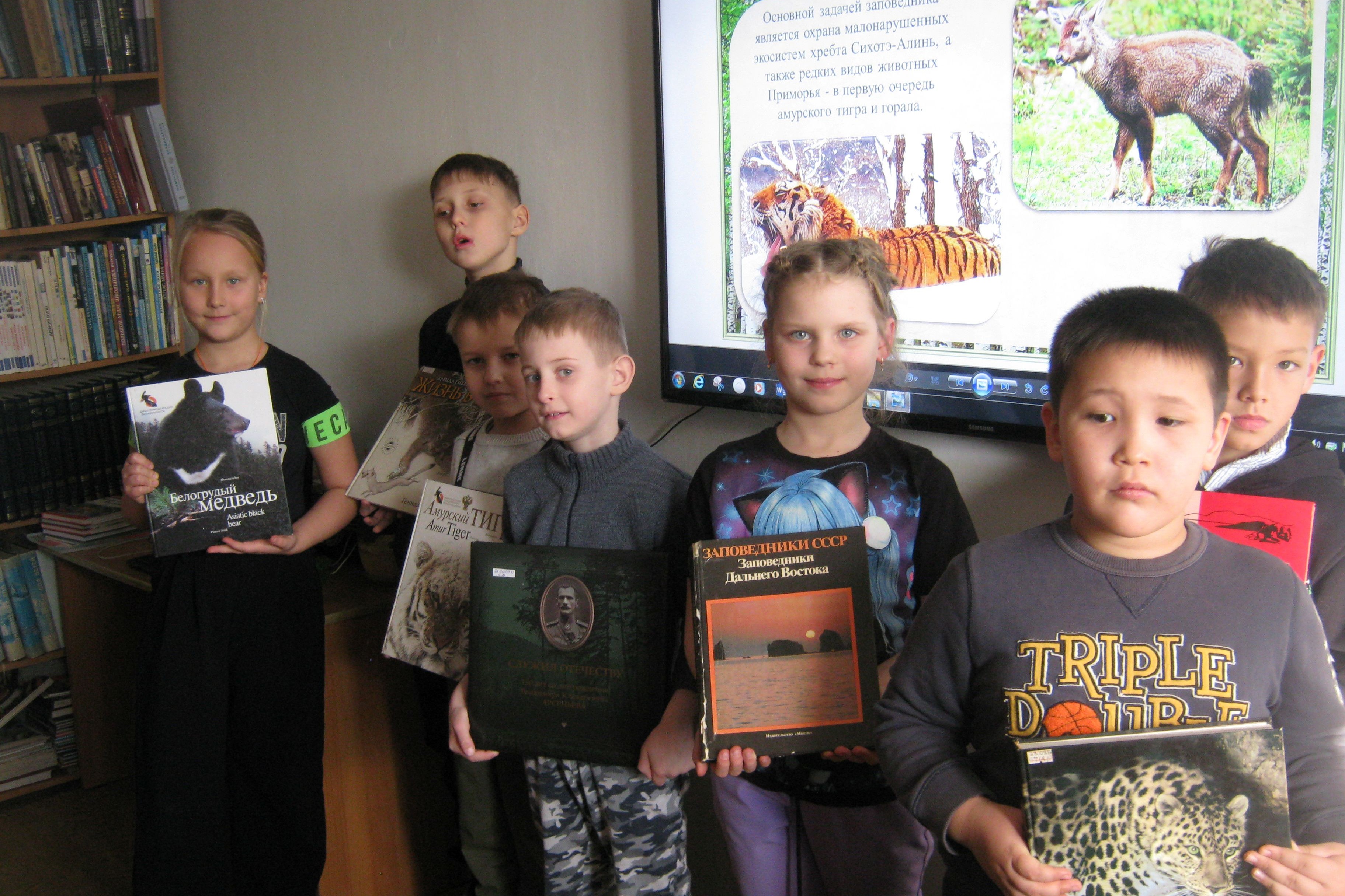 Для сегодняшних школьников история заповедника, жизнь диких зверей на воле, и их охрана стали хорошим поводом порассуждать о красоте заповедных мест и необходимости иметь таких мест побольше. Презентация Сихотэ – Алинского заповедника вызвала бурю эмоций от «Ой, как красиво», до «Такой красоты нет больше нигде в мире». Красоты Сихотэ – Алинь описывал еще Владимир Клавдиевич Арсеньев в своей книге «Дебри Уссурийского края», много ученый – путешественник уделял внимания и описанию тигра. Ребята обеих групп рассматривали тигра, горала, белогрудого медведя, рысь на кадрах презентации с восхищением. Школьники пришли со своими рисунками старательно нарисованными родителями и разукрашенными ребятами. Заинтересовались дети и книгами, представленными для обзора, до последней странички дети старательно изучали жизнь тайги и ее обитателей. Эко урок понравился, попросили школьники провести и соревнование на знание Сихотэ – Алинской фауны и флоры, но это уже будет в другой раз.