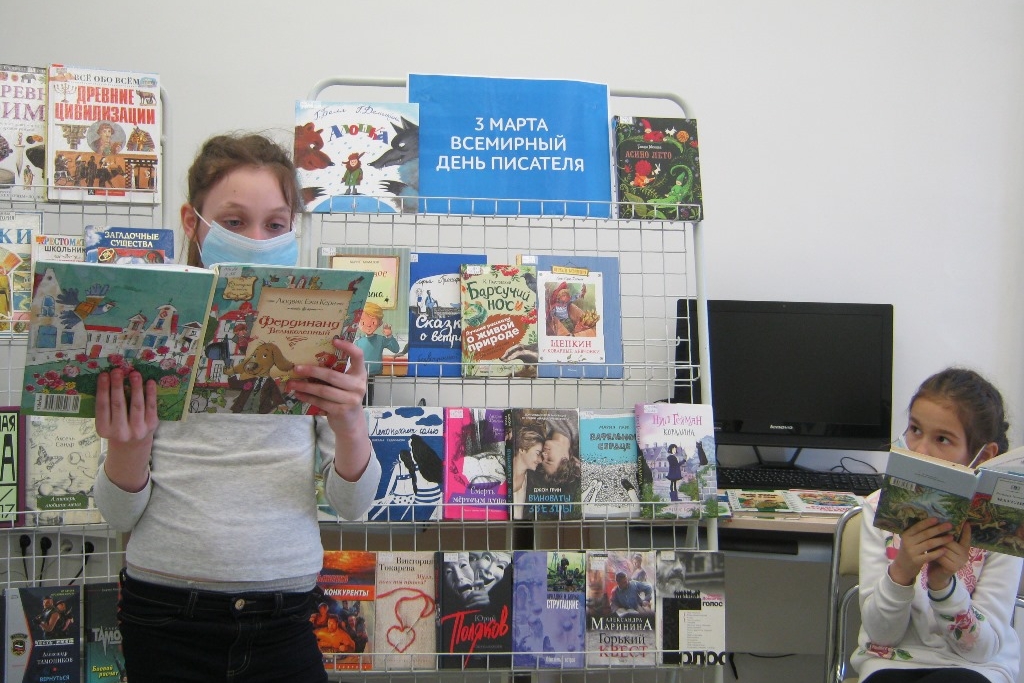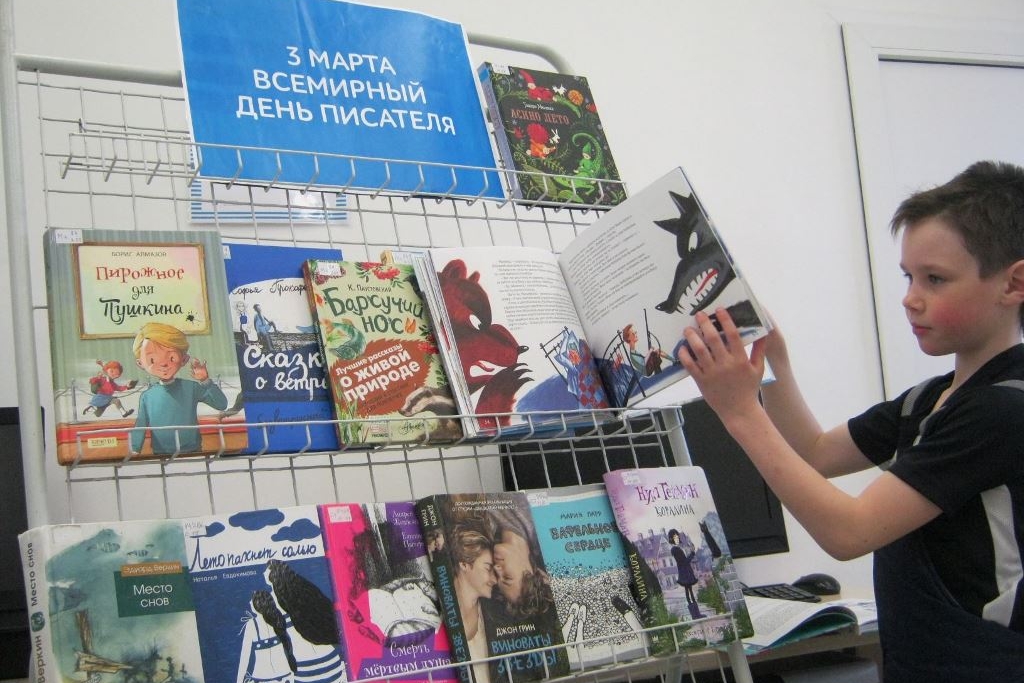 В преддверии Всемирного дня писателя библиотека №8 подготовила выставку книг, чтобы читатели обратили внимание на разнообразие серий и жанров. Детская часть выставки книг накануне 3 марта ненадолго покинула свое место на стеллаже и отправилась в ЦРТДиЮ, прямо на урок к детям.