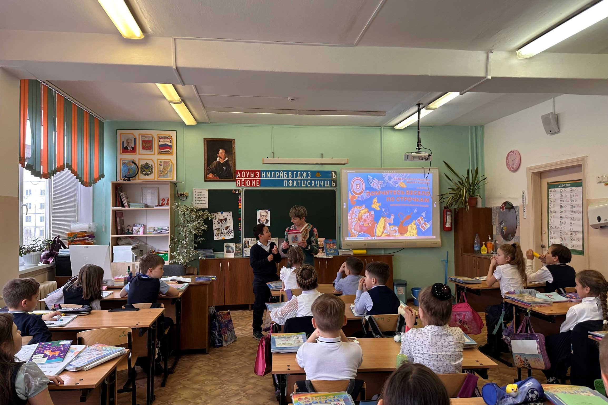 В этот раз шла речь о советских писателях-юбилярах марта и апреля. Второклассники познакомились с творчеством Валентина Берестова, которому 1 апреля исполнило 95 лет со дня рождения. Среди его стихов есть цикл о школьных принадлежностях, поэтому ребятам было предложено собрать портфель, отгадывая загадки по его стихам, что они с удовольствием и делали. Потом обнаружили и решили две его математические задачки, а прослушав отрывки стихотворений о природе, догадались, о ком идет речь. Ну и, конечно, хором декламировали: «Как хорошо уметь читать!».