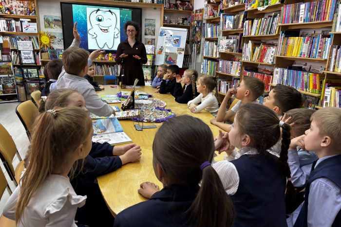 8 апреля ученики 2 «В» класса школы №74 в детской библиотеке №7 (ул. Калинина, 281) участвовали в познавательной беседе «Пусть улыбка сияет здоровьем!», которую для них провела врач стоматолог клиники «А — Стом» Юлия Бойченко.