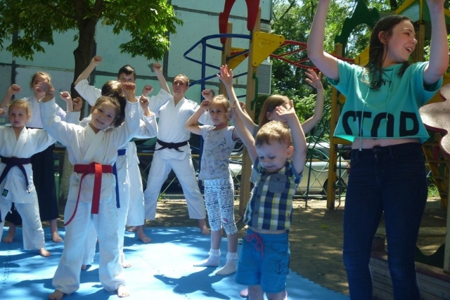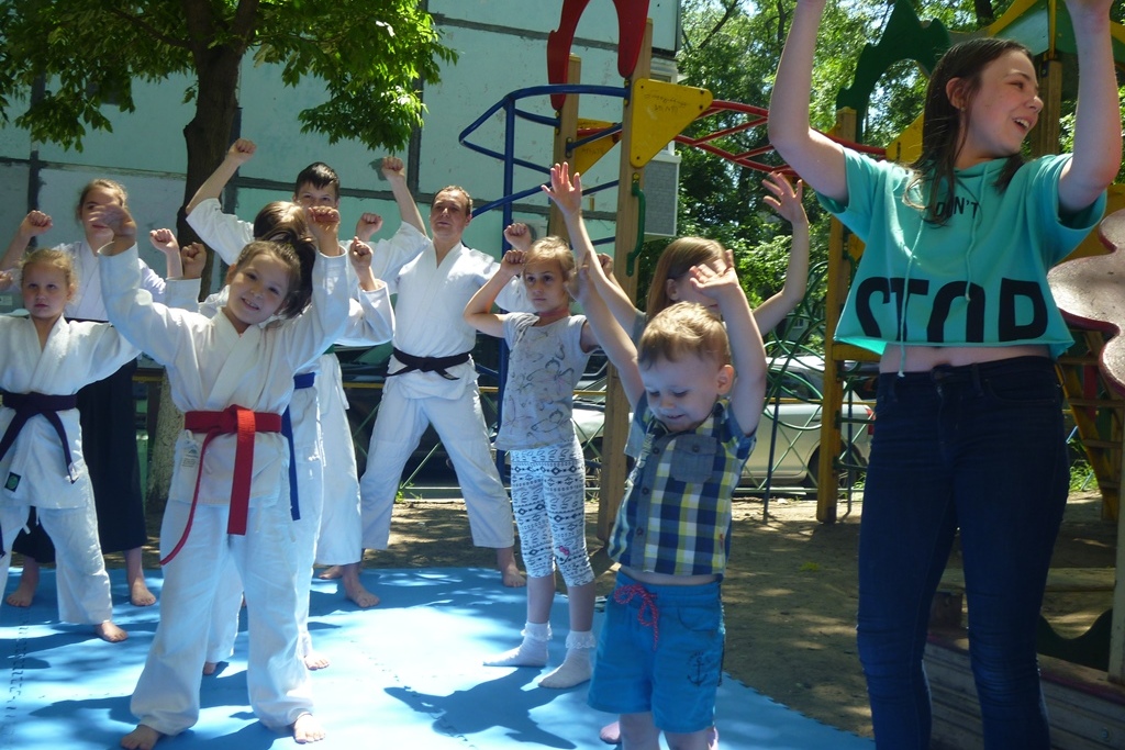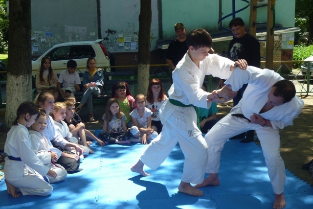 Ребят с айкидо знакомили опытные тренеры «Центра развития физической культуры и спорта «Олимп», Ростовский Николай Витальевич, 2 дан, в айкидо — 17 лет, Денисова Елена Николаевна, 1 дан, в айкидо — 19 лет, Аленин Алексей Алексеевич, 2 кю, в айкидо — 8 лет.