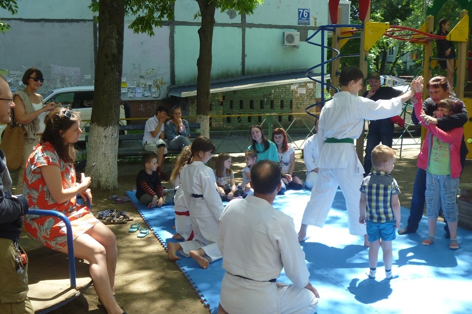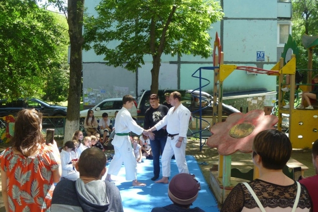 После знакомства с историей айкидо, юные читатели библиотеки смогли поучаствовать в разминке на татами. Мероприятие переместилось на придомовую территорию библиотеки. Разминка чередовалась с демонстрацией приемов, также зрители посмотрели бой с бокенами (деревянные мечи) и танто (деревянный нож). Было много зрителей, люди с интересом наблюдали за занимающимися на татами.