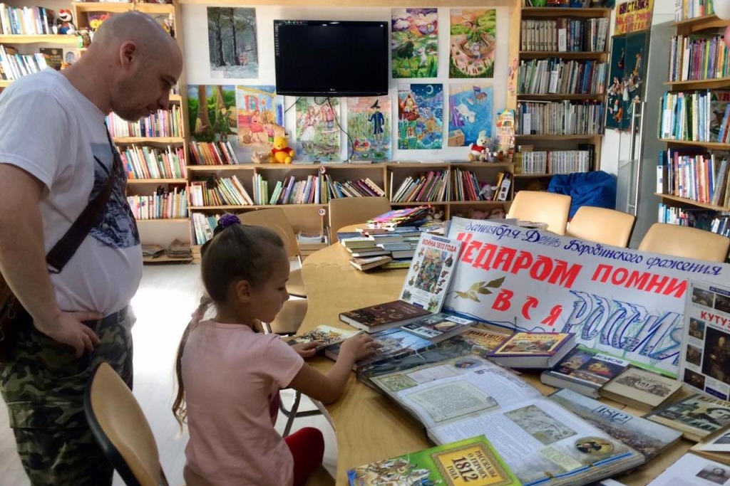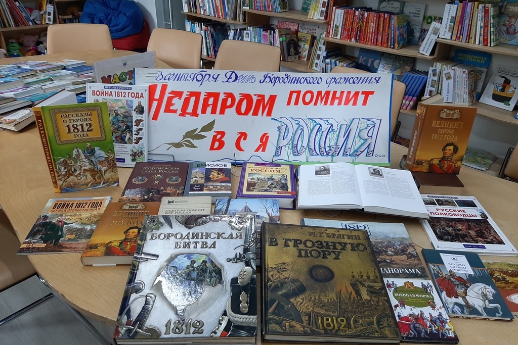 В детской библиотеке №7 читатели и их родители знакомились с книжной выставкой «Недаром помнит вся Россия» и отвечали на вопросы блиц-викторины по теме «Бородинское сражение». На несколько вопросов ответы найдены сразу, но большинство правильных отгадок пришлось искать в книгах. Ребятам и взрослым очень понравились красочные и очень подробные книги «В грозную пору» Михаила Брагина, «Бородинская битва» Тамары Эйдельман и Катерины Бутман.