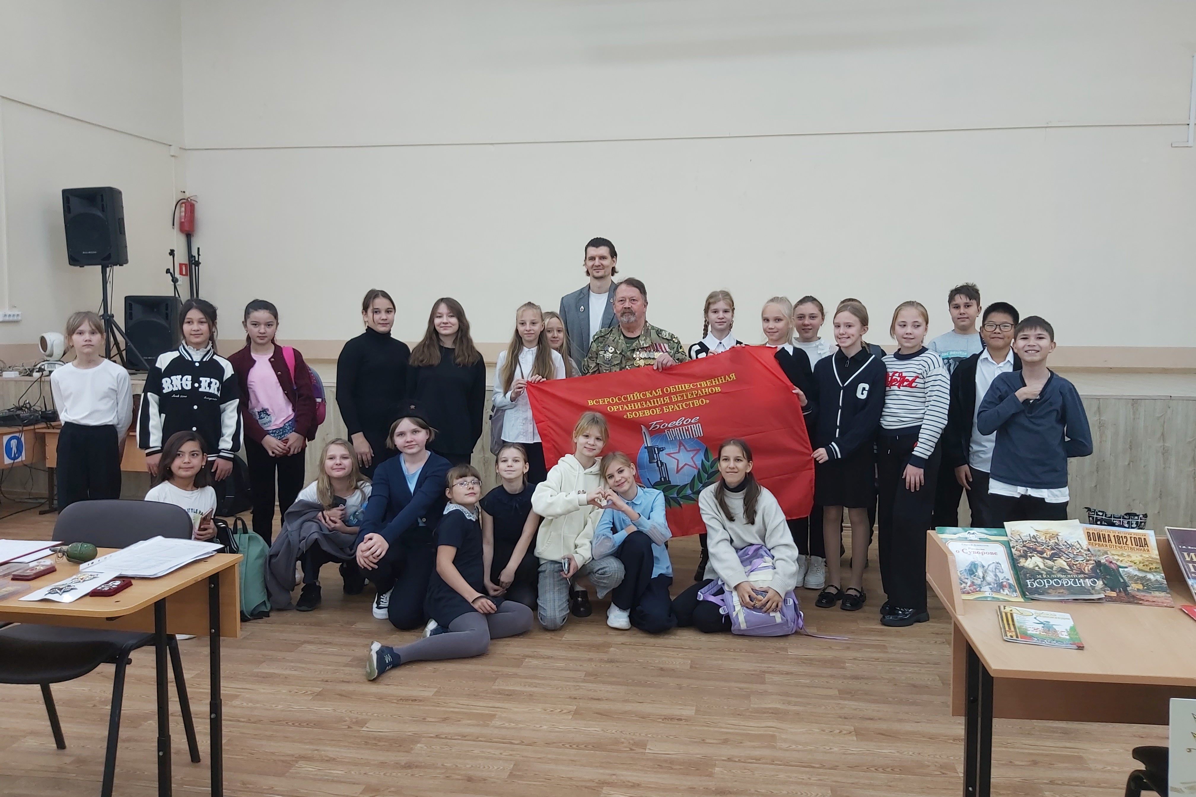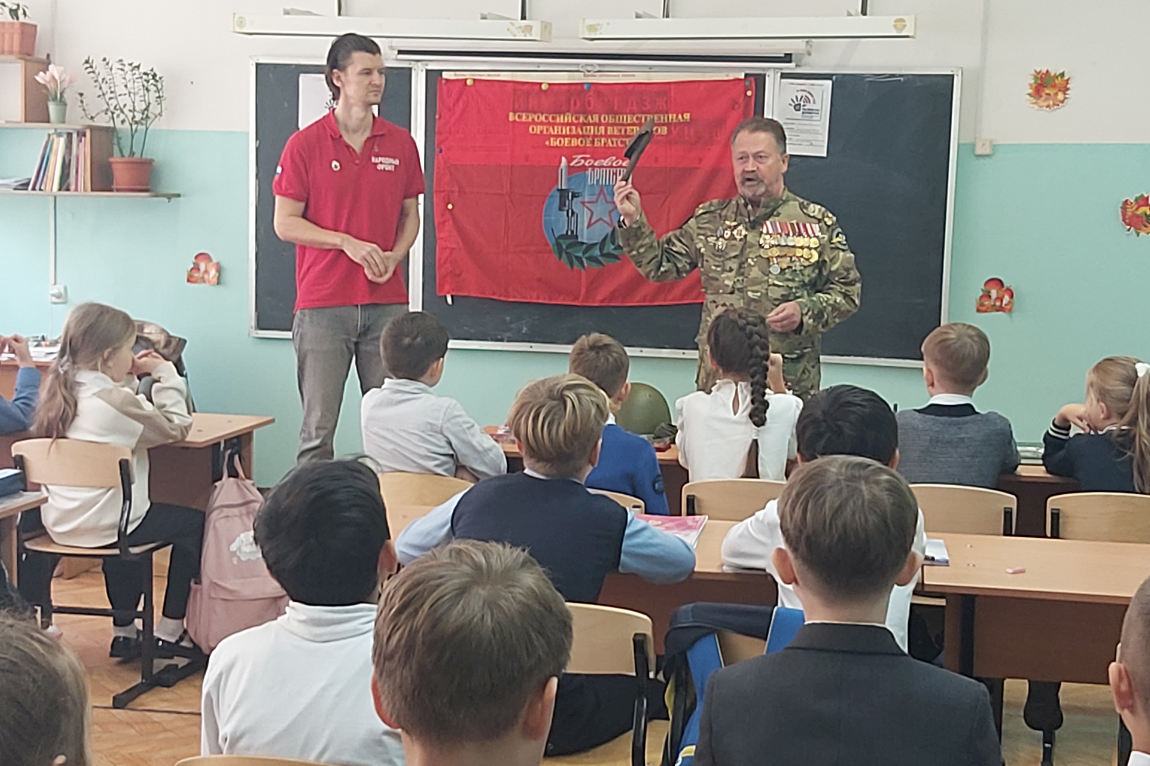 С большим интересом и вниманием школьники слушали о военных событиях, о людях и их героических поступках, о воинской доблести. Детям были показаны боевые награды разных лет. Александр Петрович рассказал о себе и своем «Боевом братстве» (Всероссийская общественная организация ветеранов). С большим уважением ребята слушали гимн «Боевого братства».
