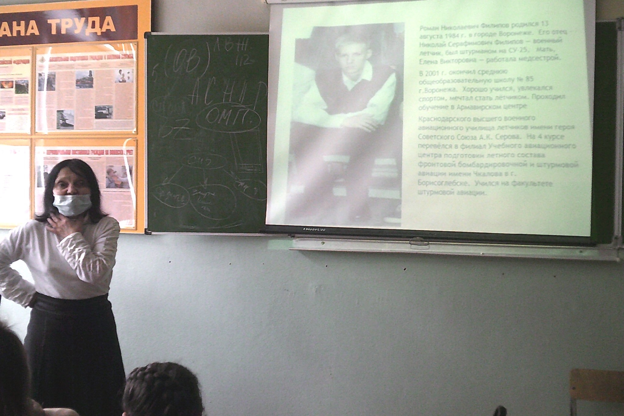 А в заключение рассказа учащиеся прослушали песню «Улетают они» группы «Бутырка», посвященную подвигу Романа Филипова. Видеоряд клипа – это хроникальные кадры жизни и подвига Героя России и фрагменты программ информационных агентств мира, освещавших его.
