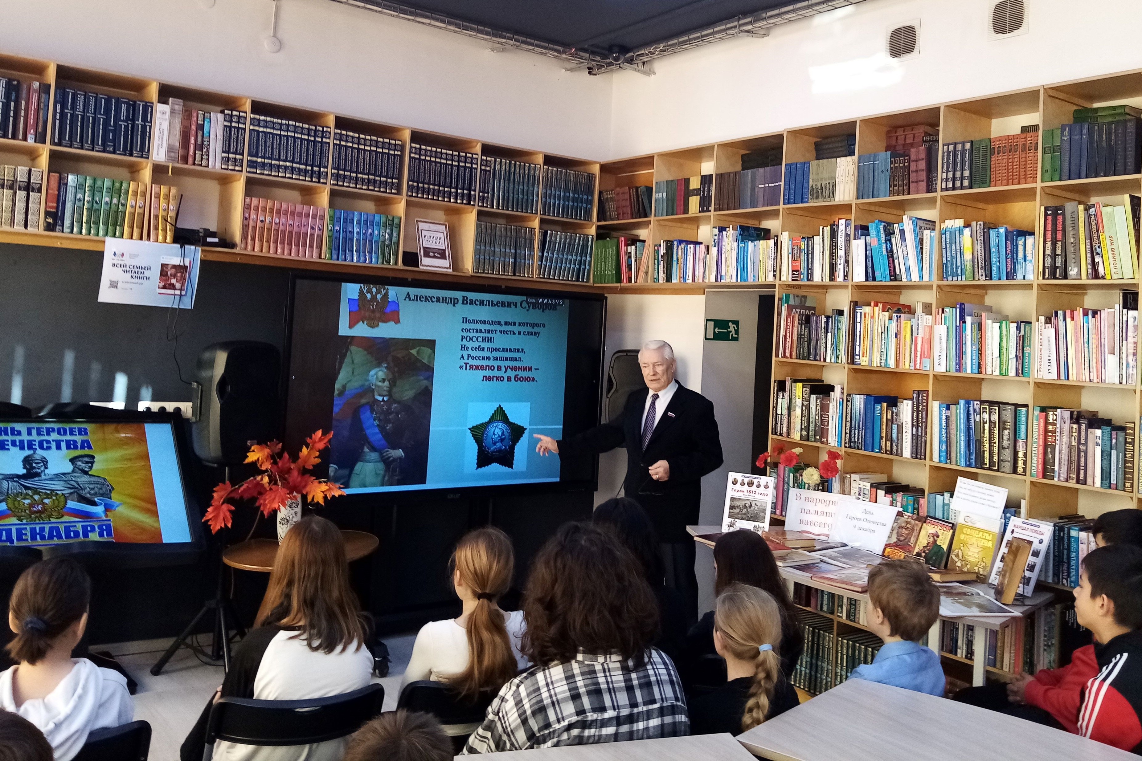 В преддверии дня Героев Отечества в библиотеке № 12 прошёл урок истории «Героям Отечества забвенья нет». Восьмиклассники Образовательного центра «Ступени» с большим интересом слушали рассказ писателя-краеведа Николая Васильевича Сидорова об истории возникновения праздника, который напрямую связан с учреждением ордена Святого Георгия Победоносца. День героев Отечества в России выпадает на 9 декабря, что является продолжением вековой традиции, существовавшей в российском государстве до 1917 года. Именно в эти дни в Российской Империи праздновали День георгиевских кавалеров. Императрица Екатерина II – в 1769 году учредила орден Святого Георгия Победоносца. В те годы этим орденом награждались воины, проявившие в бою доблесть, отвагу и смелость. И сегодня в День Героев Отечества – в России чествуют Героев Советского Союза, Героев РФ и кавалеров ордена Святого Георгия и ордена Славы. Ребята узнали имена славных героев-орденоносцев времен Отечественной войны 1812 года, Первой мировой войны, Великой Отечественной войны. Также Николай Васильевич рассказал и о героях нашего времени, героях Чеченской и Афганской войн, героях специальной военной операции.