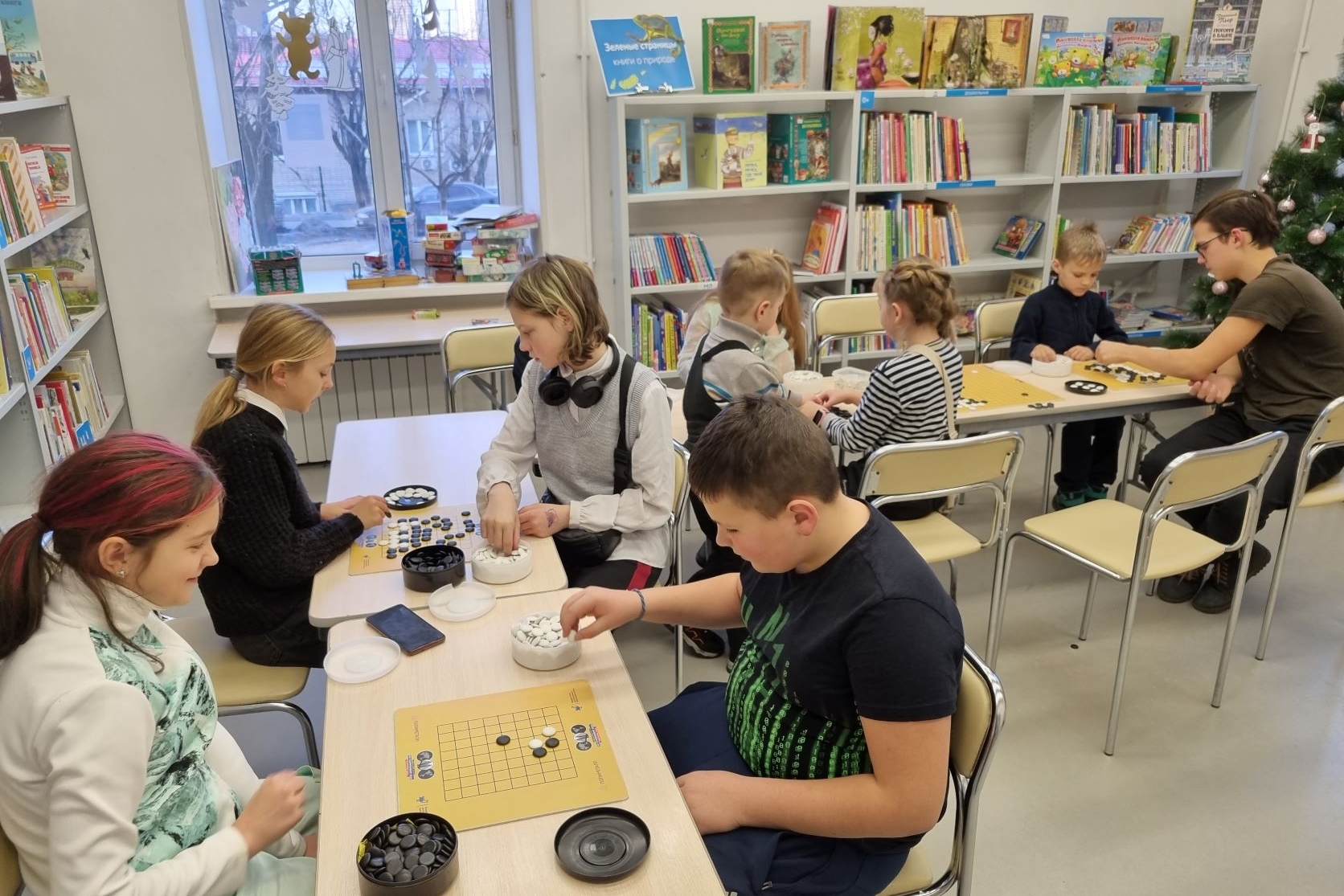 На секцию Го в библиотеку ходят люди не только морозоустойчивые, но и серьезные, если новогоднее настроение и чувствуют, то не выражают это так бурно как детвора на творческой мастерской. Самые младшие игроки в Го шалят, как обычно, а подростки, очевидно, будут ждать, когда закончатся новогодние каникулы, чтобы снова встретиться за доской с черными и белыми камнями.