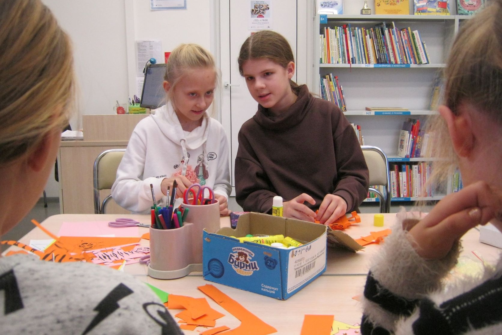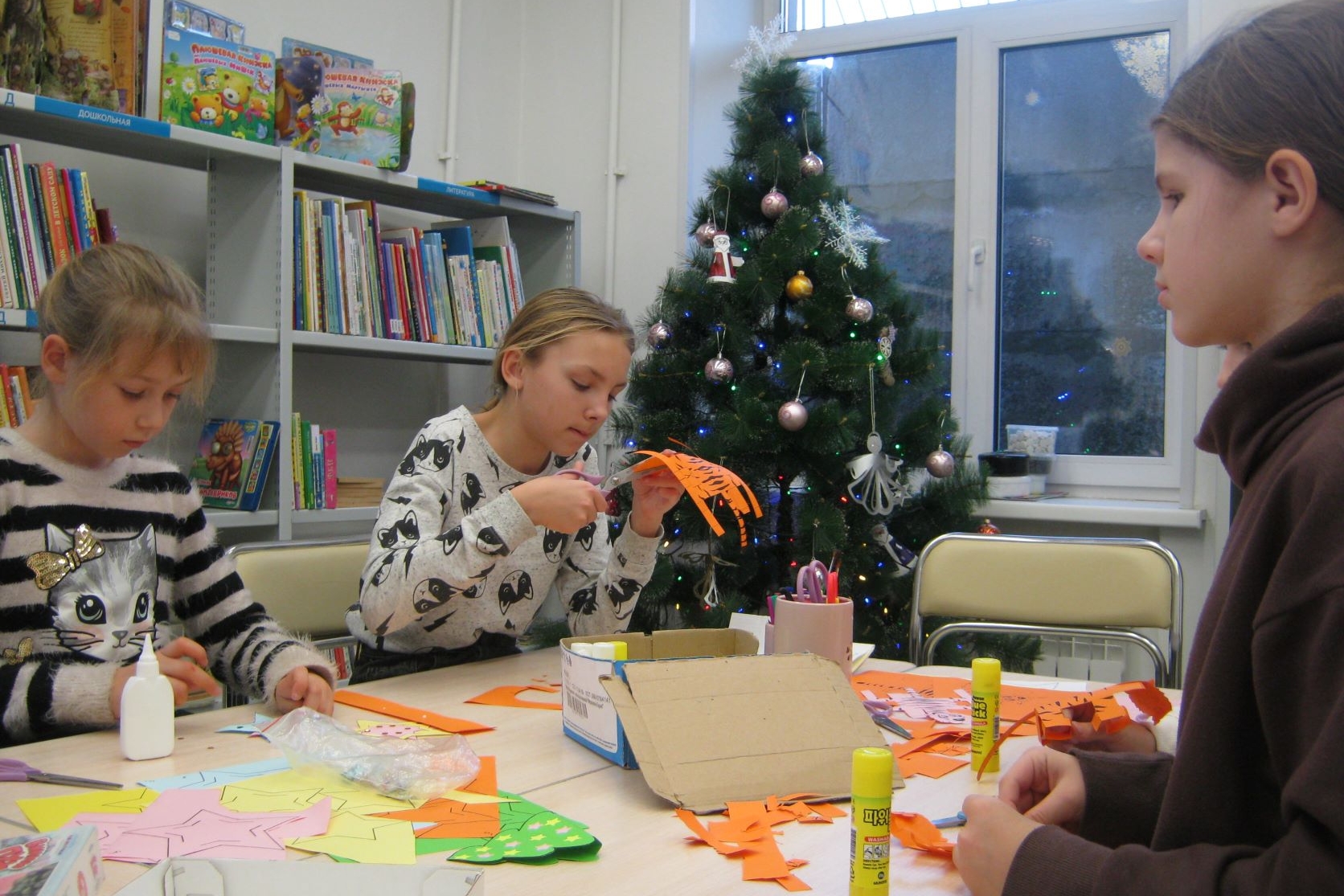 В предновогодние дни в библиотеке № 8 как обычно, собралась детвора на творческую мастерскую. Заглянули во вторник в библиотеку и школьницы постарше: часть девочек расположилась на детском абонементе с настольными играми, другие предпочли игротеке ножницы и клей, видимо, вспомнили, как раньше приходили в библиотеку на творческие мастерские. Даже взрослые были не против присоединиться к детворе и смастерить новогоднюю игрушку.