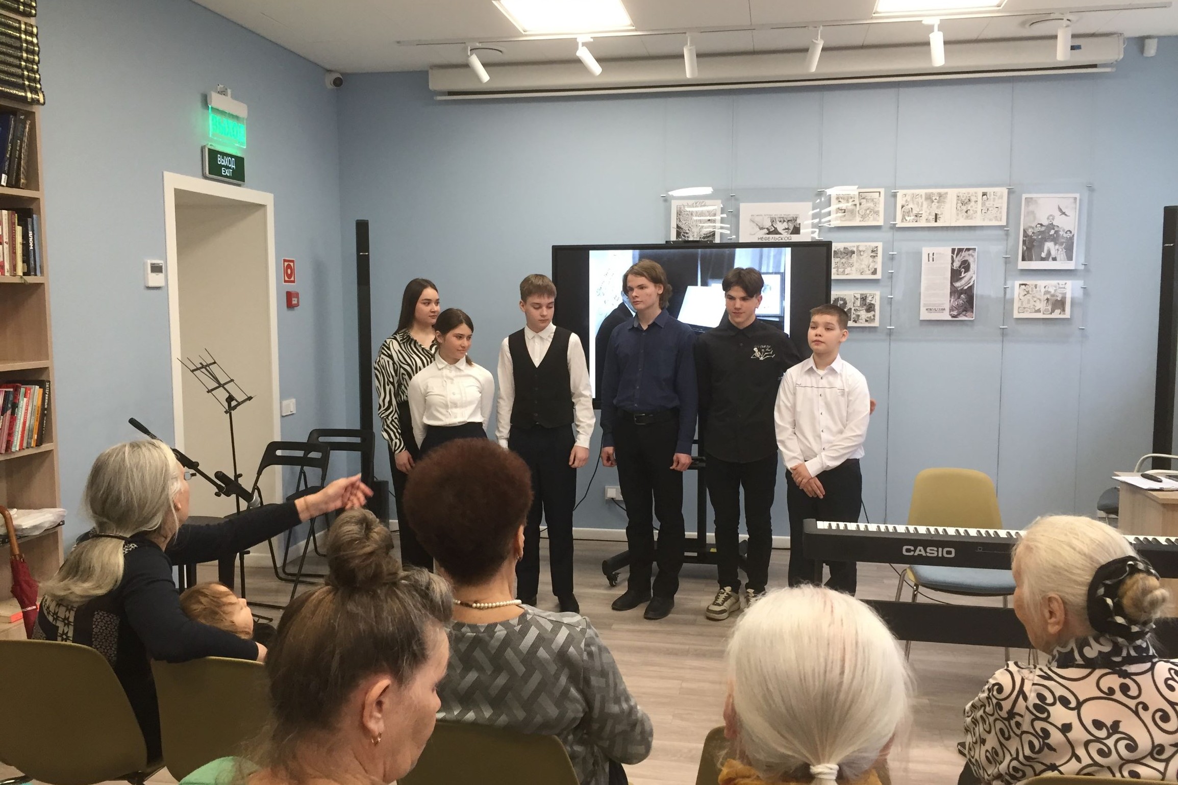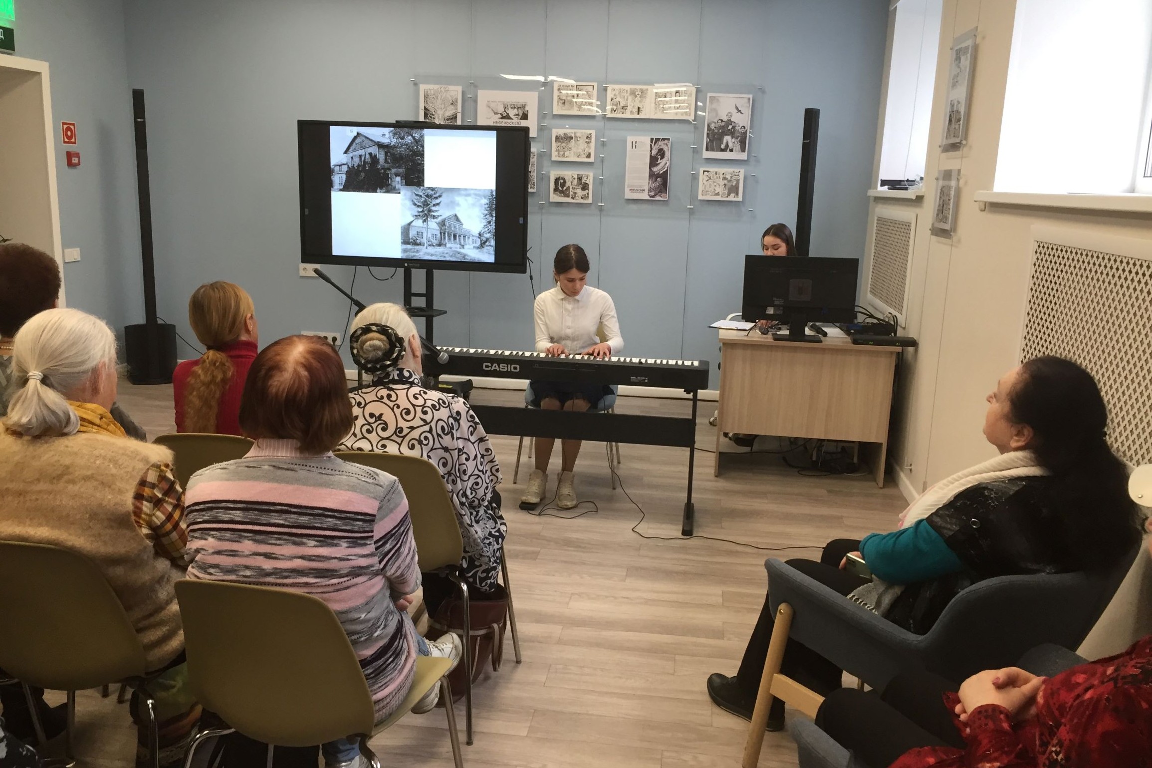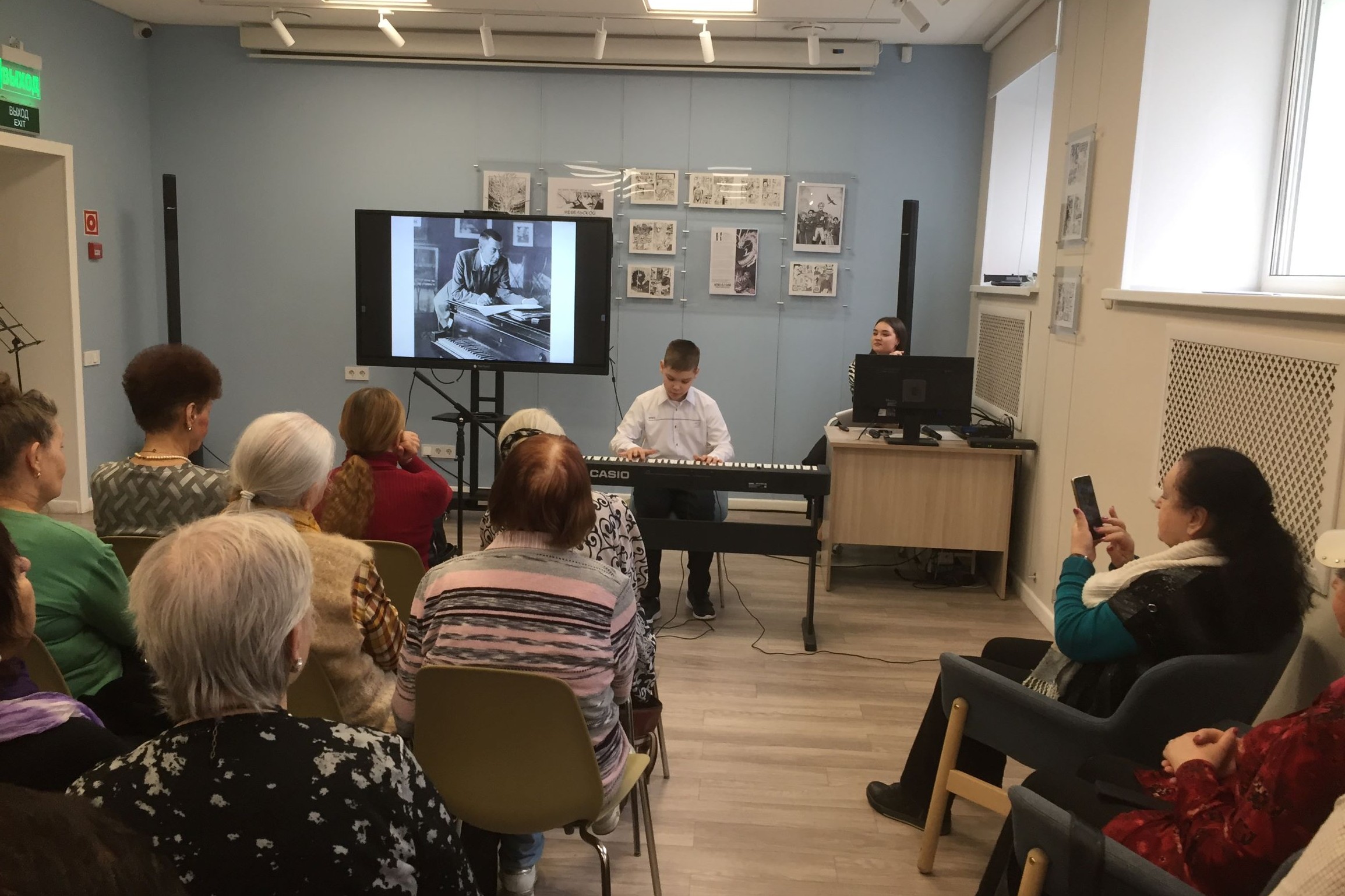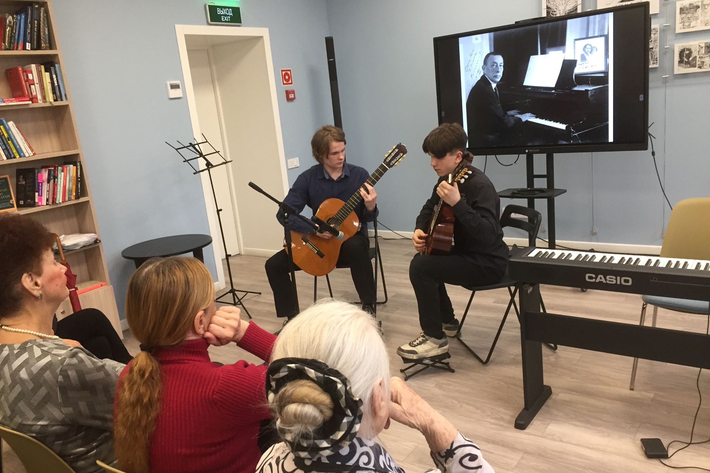 Лекция была иллюстрирована исполнением произведений великого музыканта в записи, а также живым исполнением классических произведений учащихся школы искусств. Ребята очень старательно и бережно исполняли знакомые мелодии – «O, sole mio» — на фортепиано Камила Мельник, Николай Кузи-Алексинский исполнил «Итальянскую польку», а Кирилл Зверягин — «Старинный Вальс». Очень порадовали зрителей молодые гитаристы Сергей Ананенко и Иван Еремин, которые в дуэте и сольно очень талантливо сыграли несколько произведений, в том числе романс «Мчится тройка почтовая», «Фламенко», «Бразильский танец».