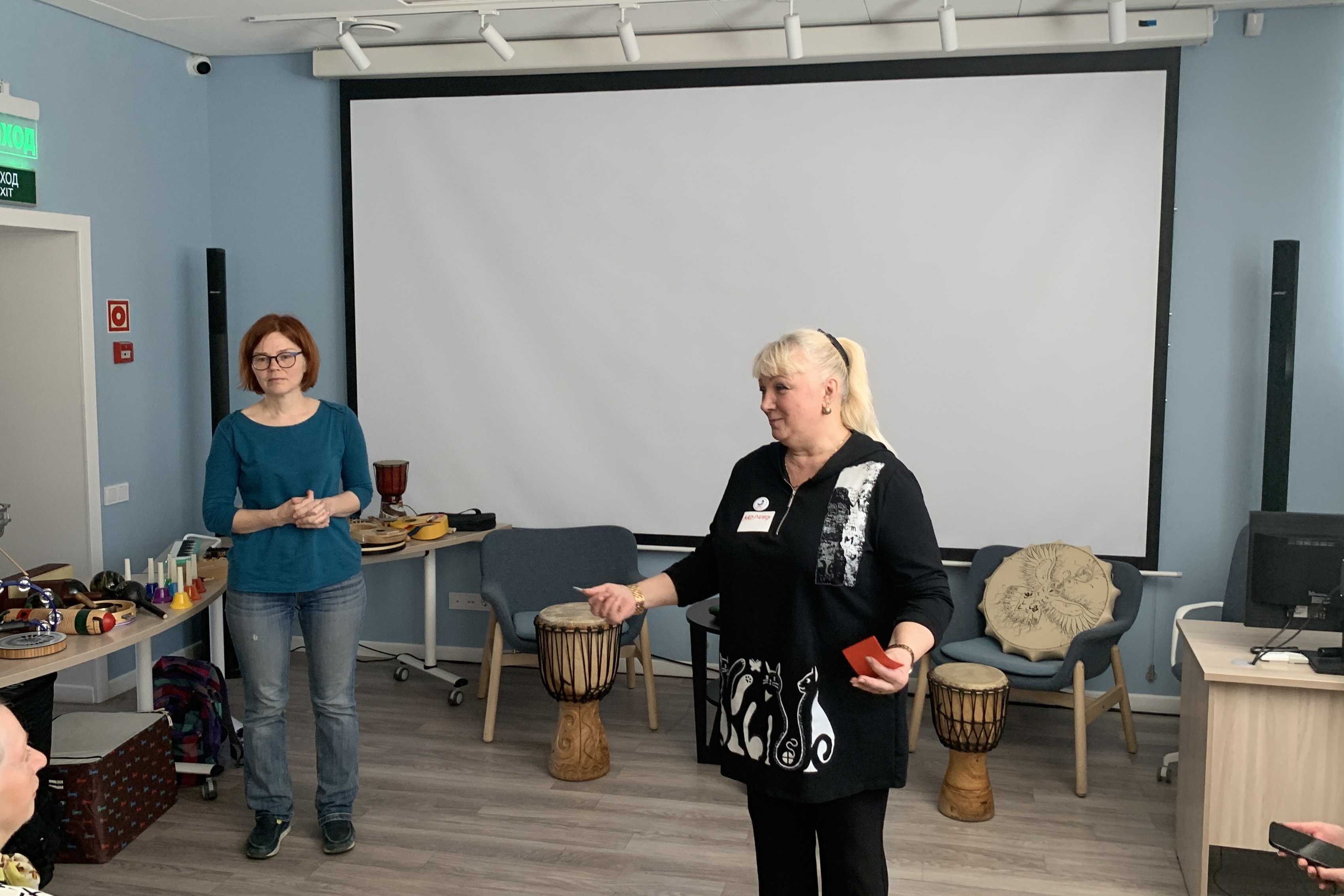 Гостей ждало приятное общение с чаепитием, музыкально-терапевтический мастер-класс «Свободная импровизация» с использованием перкуссионных, этнических и экзотических музыкальных инструментов. Его провела Лобусова Ольга, музыкальный терапевт, руководитель творческого пространства «Арт-тир».