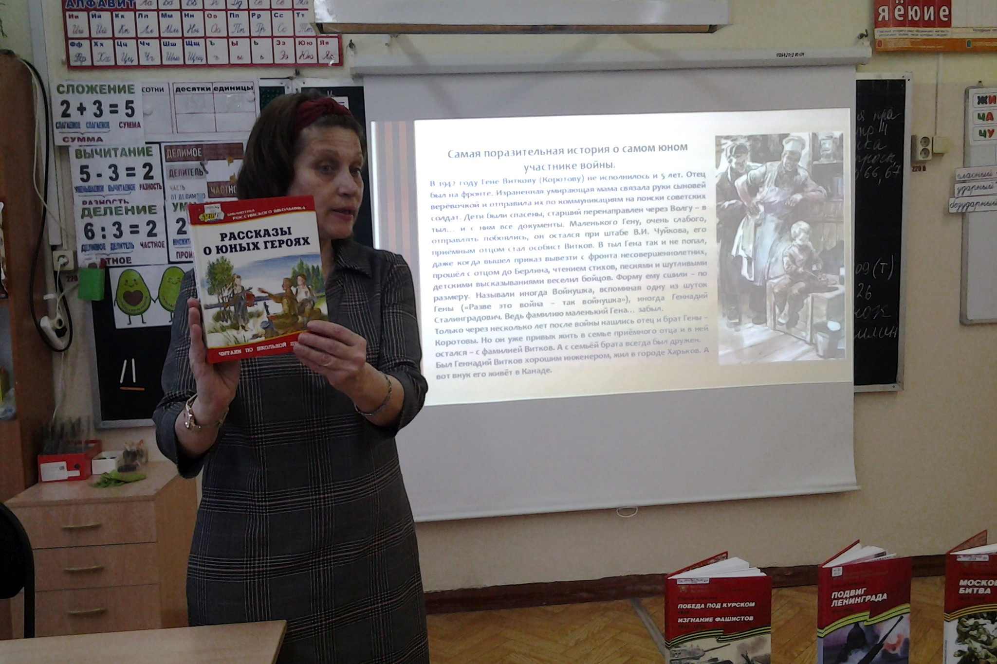 Дети слушали трогательную историю Льва Кассиля «Рассказ об отсутствующем» о маленьком безымянном герое, который ценой собственной спас целую часть. Завершили встречу чтением произведения Владимира Железникова «Девушка в военном». Автор рассказал ребятам о поступке молодой женщины-санитара, которая 10 часов ползком на своей спине тащила тяжело раненого солдата. И в день ее рождения, спустя много лет, этот боец пришёл увидеть свою спасительницу. А эта Нина –мама одного мальчика, который даже не знал, что у него такая отважная мама…