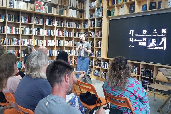 В рамках фестивального проекта «Ради света» и «Междисциплинарной лаборатории по современному театру», на площадке библиотеки БУК, в июле состоялась увлекательная лекция-встреча по истории документального театра. Александрина Шаклеева, театральный критик, куратор проектов и фестивалей не только осветила историю развития театральной документалистики в России, но и подробно остановилась современном документальном театре разобрав его от моноспектакля до иммерсивного действия.