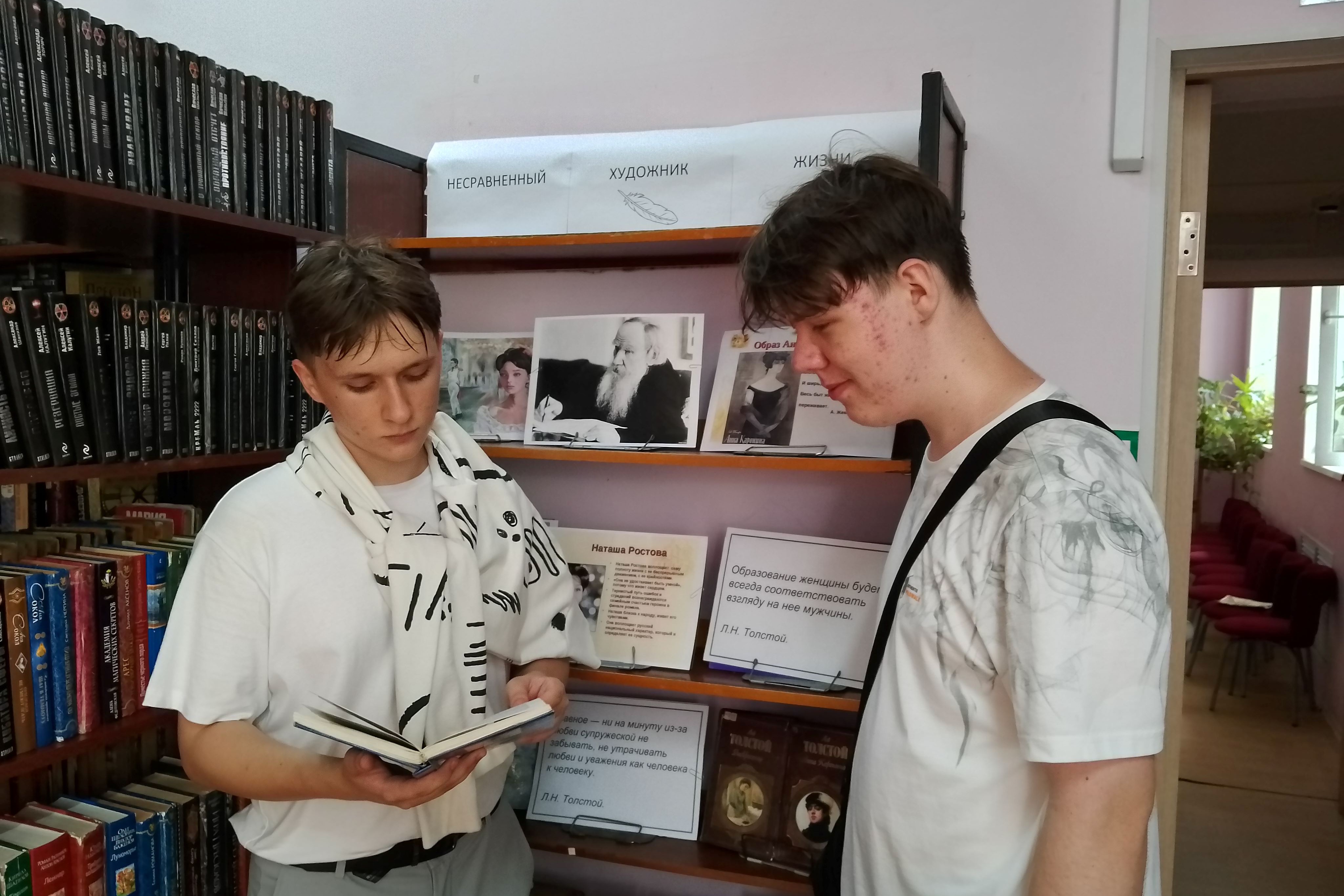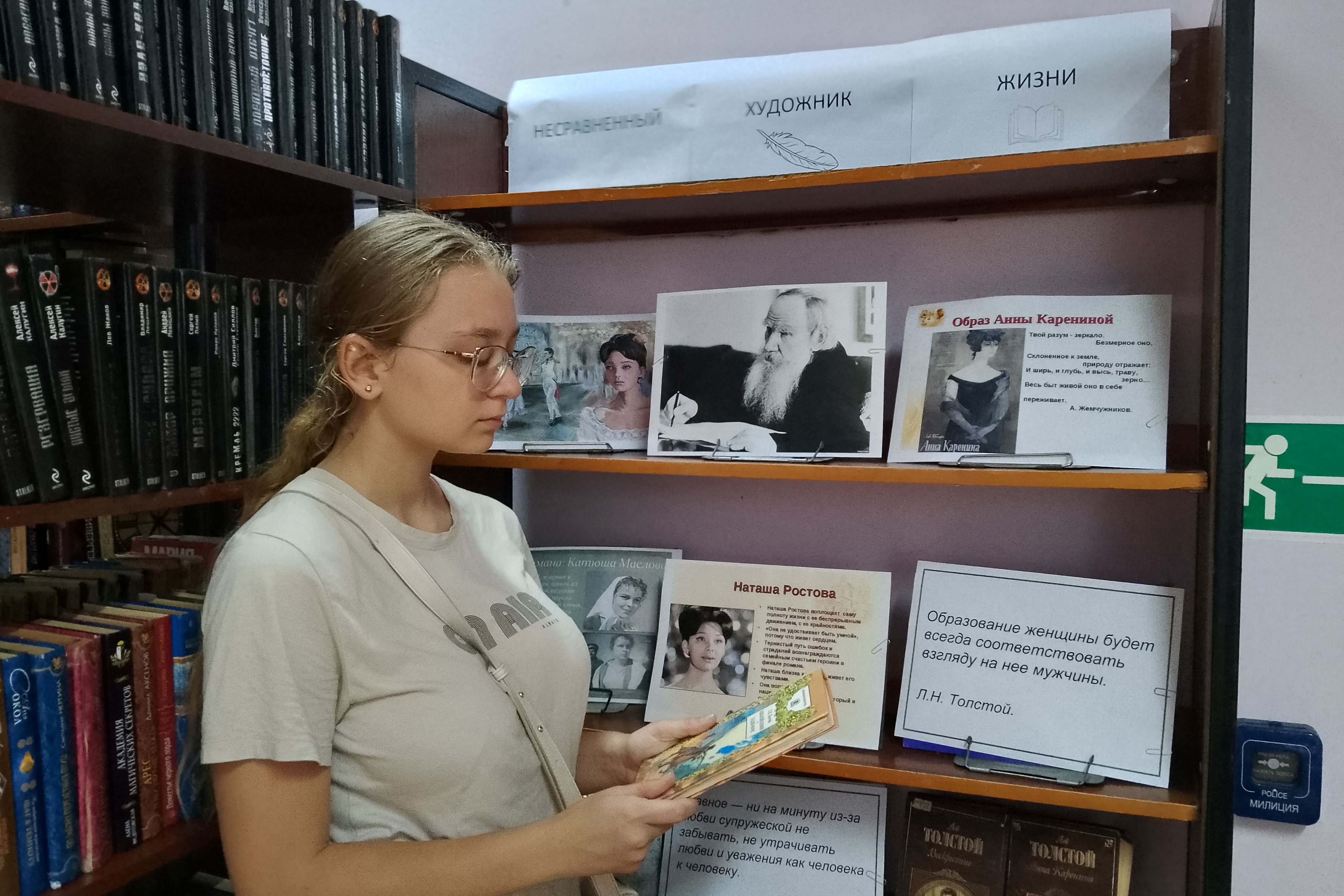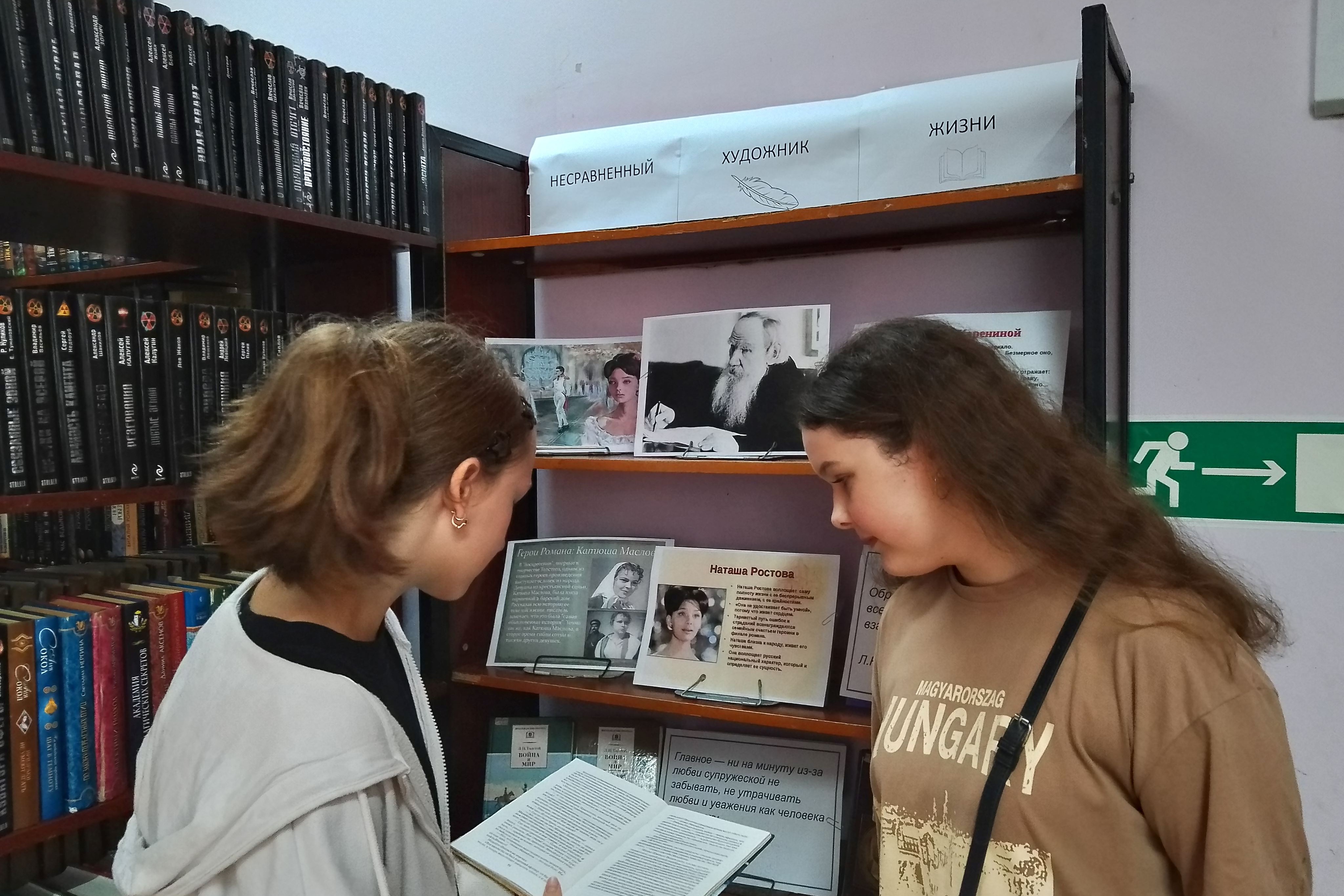 Книжная выставка «Несравненный художник жизни» организована в библиотеке №13. 2 сентября с читателями организованы беседы у выставки. Приближается юбилей великого русского писателя Л.Н. Толстого. Все мы знаем Толстого как автора «Войны и мира». Это первое, о чем говорили школьники, подходя к выставке. На вопрос — «Какие женские образы в романах Толстого вы знаете?» — приходили в легкое замешательство, а потом с воодушевлением вспоминали… Наташа Ростова, Анна Каренина, Катюша Маслова… Толстой – настоящий художник женских образов. Судьбы женщин, описанные в его романах, полны очарования и трагизма. Старшее поколение в этом плане показало эрудицию на знание произведений и главных героинь. Выставка не случайно была посвящена женским образам. Толстой Л.Н. – не только писатель, но и философ, размышлявший о семье, браке и роли женщины в обществе. Эта часть творчества стала сегодня темой для обсуждения.