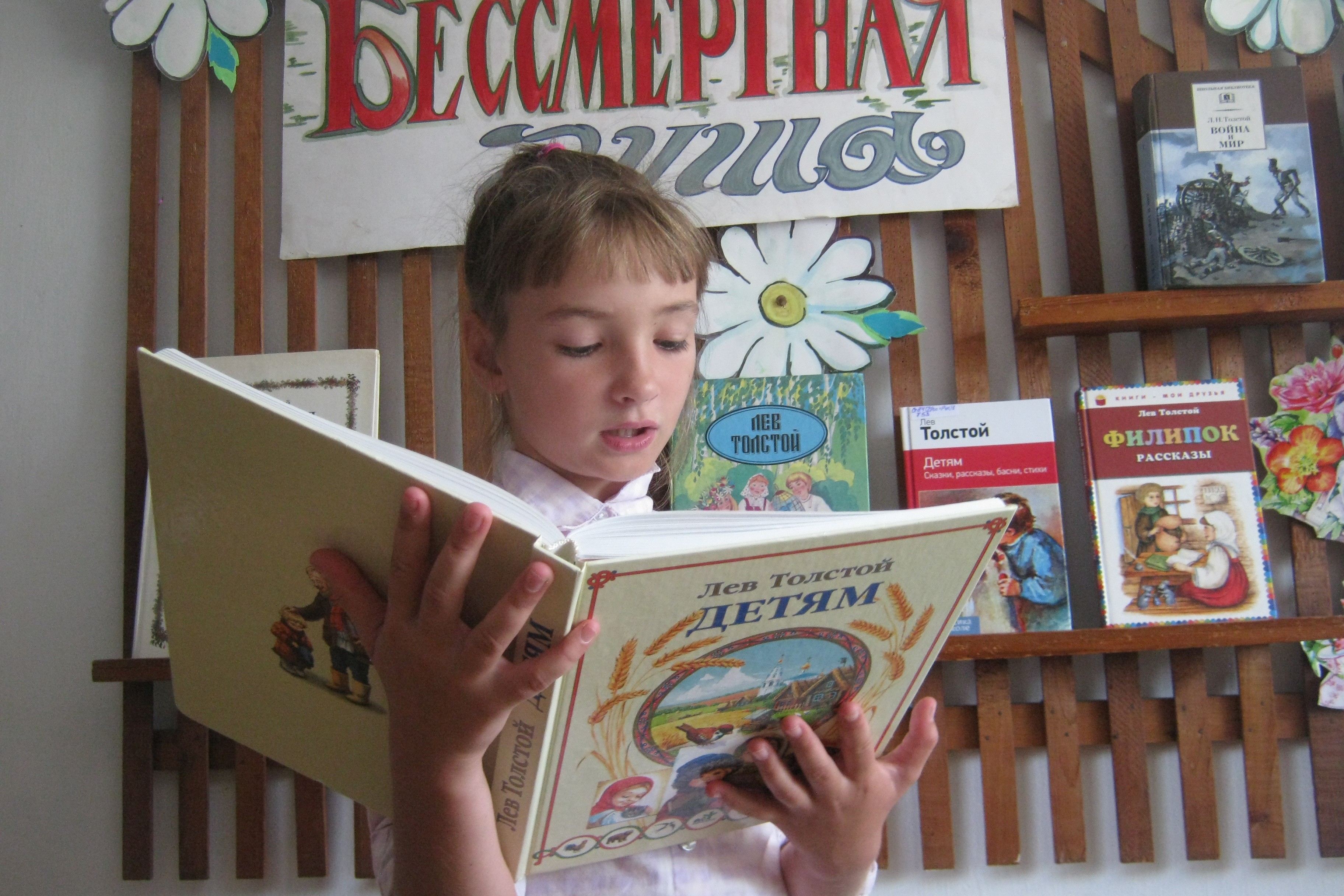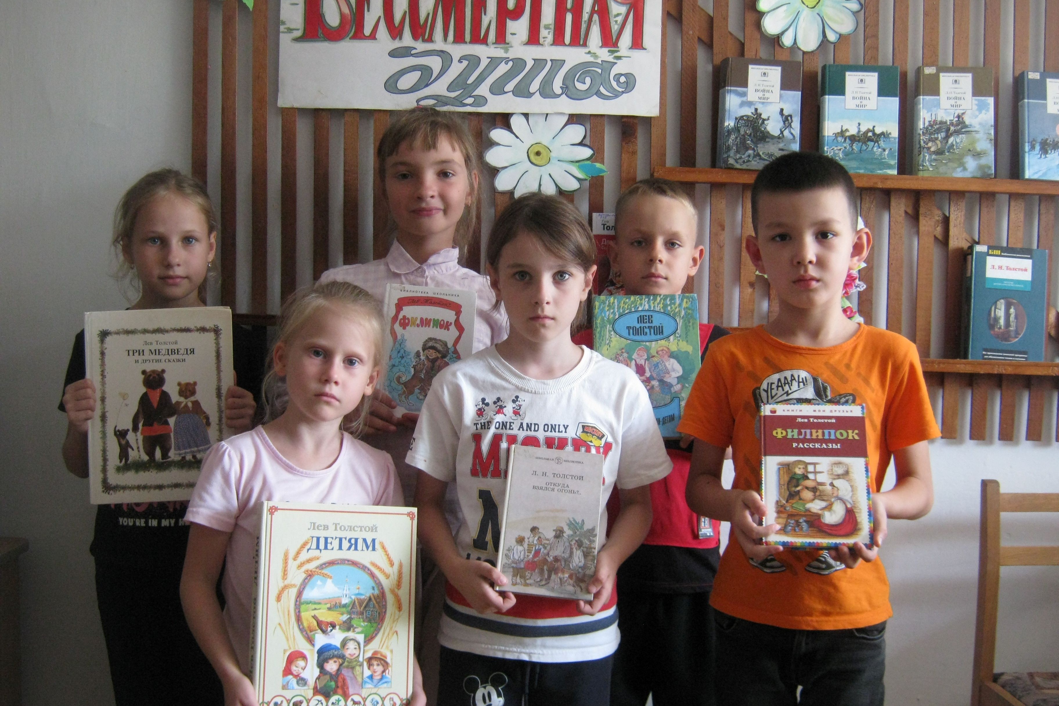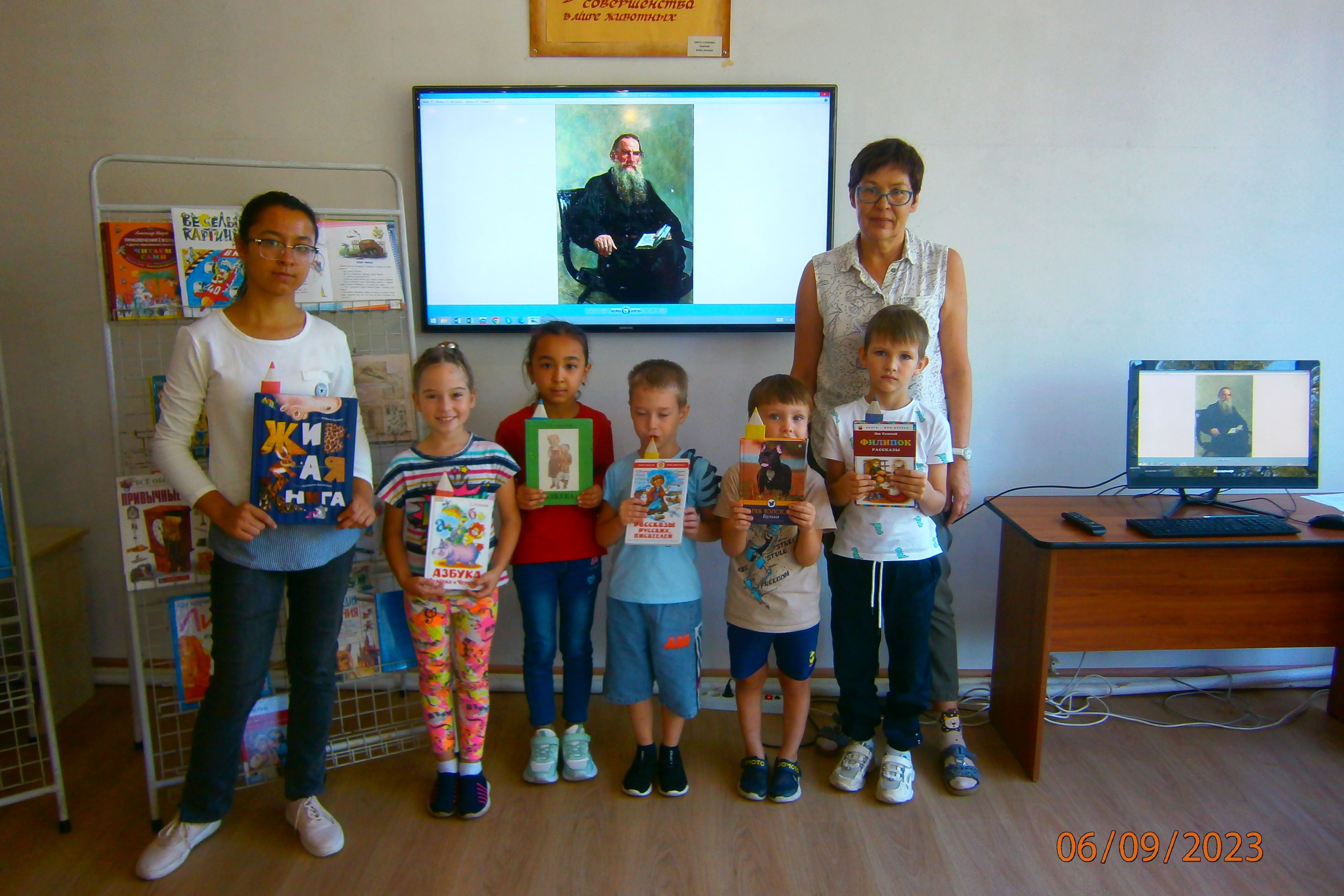 6 сентября беседа-игра «Лев Толстой детям» организована в библиотеке №15 для детей творческой студии «Дай пять». Дети познакомились со школой именитого писателя, которую он открыл в своем имении «Ясная поляна». В то время он написал приложение к «Азбуке», четыре «Русские книги для чтения». Детей познакомили со сказками, рассказами о животных и растениях, рассказы про детей. Играли в игру, возможно в ту же самую, что и 160 лет назад «Я в домике». А современная игра – квест (поиск), помогла детям научиться правильно и быстро найти книгу среди других. И хоть книга спряталась достаточно скрыто, она была найдена и победно представлена ведущей. И это книга Л.Н. Толстого «Филиппок».