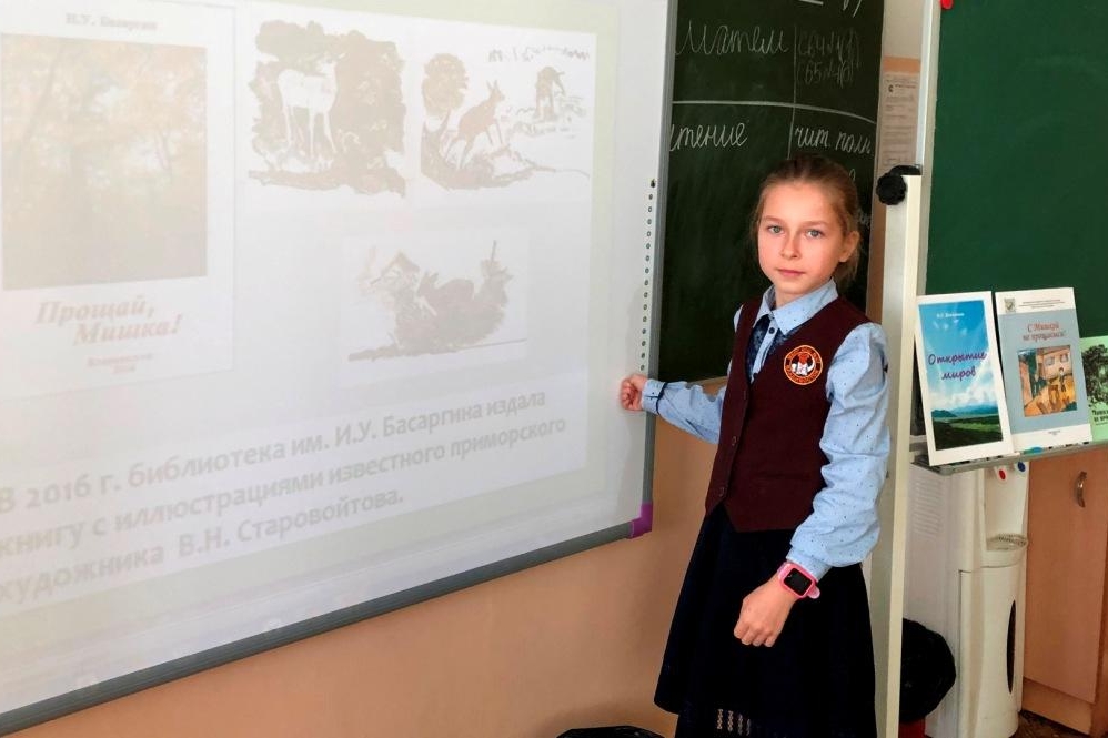 В ноябре на очередном занятии по программе «Читаем И.У. Басаргина» учащиеся 4 «Б» класса МБОУ «СОШ № 57» познакомились с рассказами о происшествиях с таежными обитателями, авторами которых были молодые писатели из поселка Кавалерово Лев Николаевич Селецкий и Иван Ульянович Басаргин.
