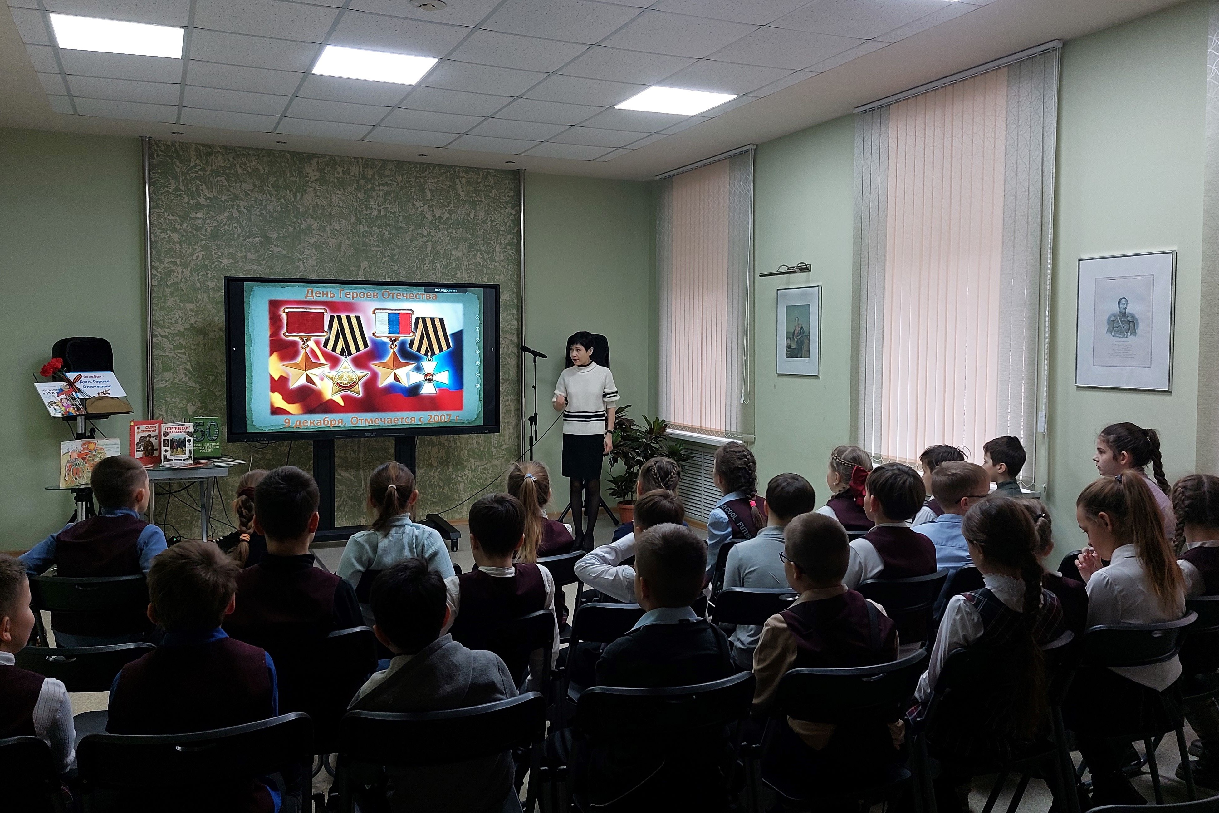 7 декабря сотрудники детской библиотеки № 7 провели с учениками 4 «Б» класса школы № 59» патриотическую беседу «Славные сыны Отечества». Ребята познакомились с героями войны 1812 года, с Героями Советского Союза, пионерами – героями. Они услышали интересные рассказы о русском богатыре Илье Муромце, о великих победах русского флотоводца Фёдора Ушакова, о семи полярных летчиках, которые были удостоены этого звания за спасение пассажиров и членов экипажа «Челюскин». Оказывается, наибольшее количество наград было вручено во время Великой Отечественной войны: более 11600 человек. Ученикам было интересно узнать, что с 1992 года в нашей стране было принято новое звание – Герой Российской Федерации. Сегодня 1214 человек получили это звание.