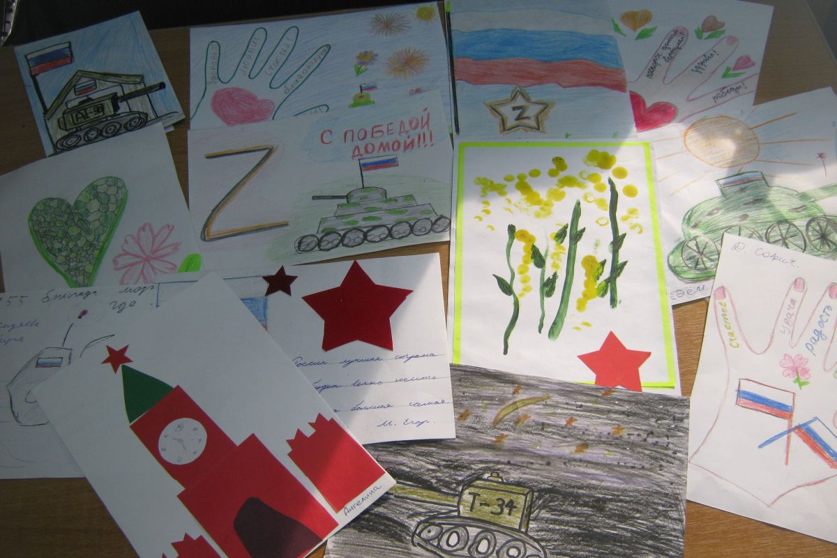 Приступая к творческому замыслу поздравлений к Дню защитника Отечества, дети выбирали мирные картины. Рисовали и делали аппликации, так, чтобы наши герои радовались, их помнят, ждут, любят. Девочки предпочитали рисовать сердечки, цветы, салюты. А мальчики рисовали грозные танки прошлых побед Т-34, и современные АЕ -90, такими сегодня и управляют наши бойцы. Небольшие пожелания скорой победы в каждой открытке. «Россия лучшая страна и будет вечно жить она, она большая самая» — написал Егор М., школьники дружно подхватили: Россия самая могучая, самая красивая, самая большая и это наша Родина!
