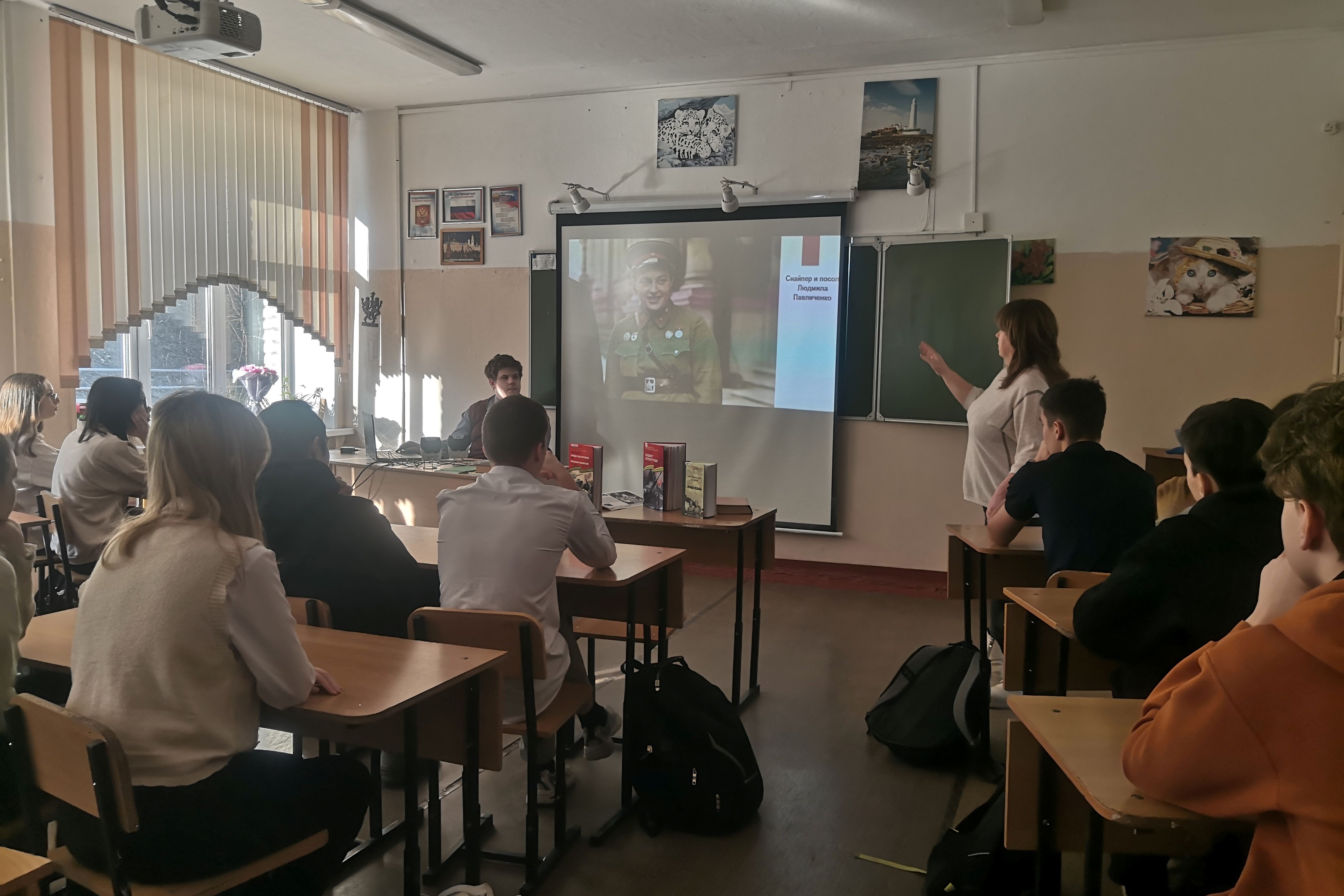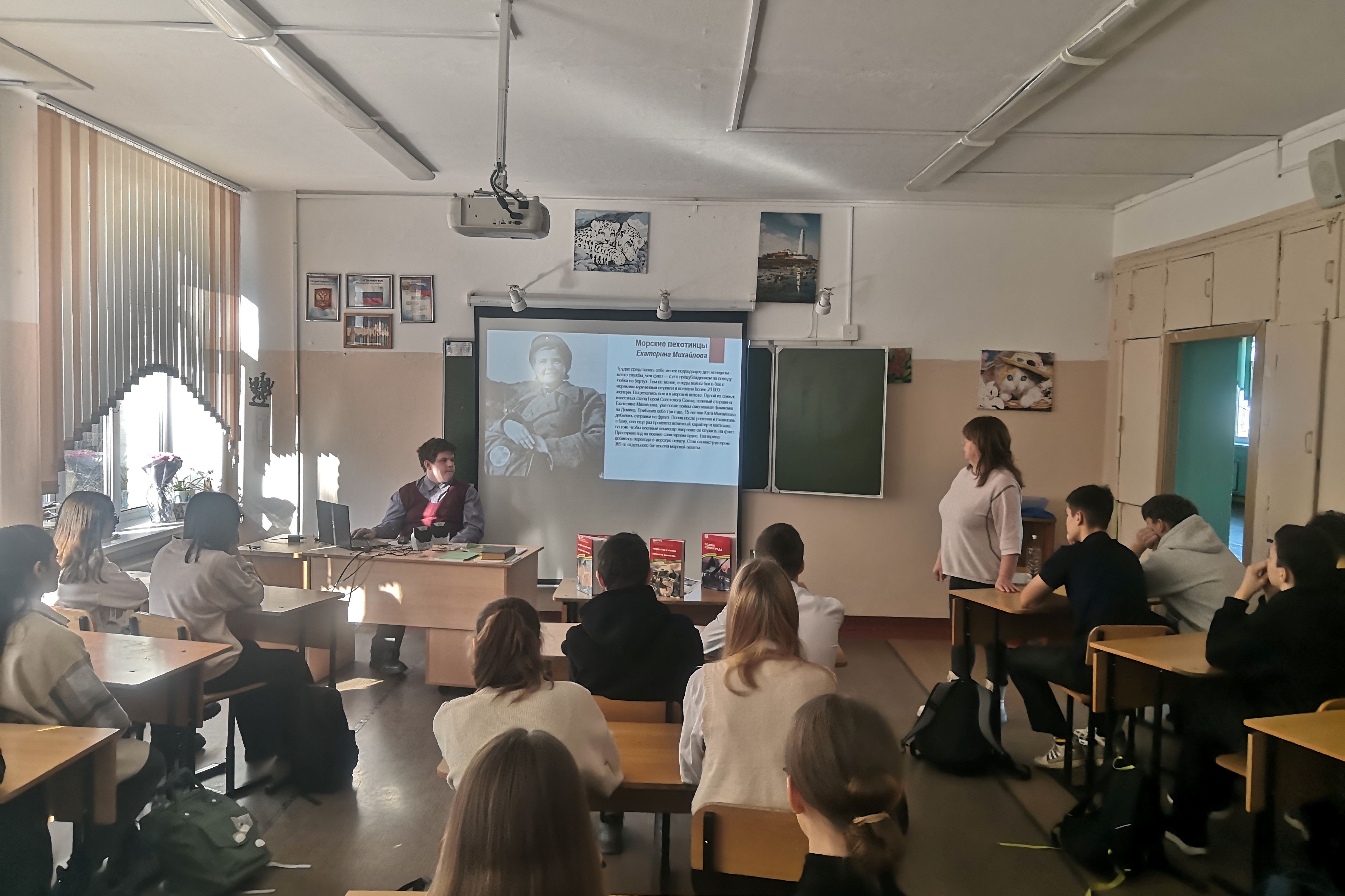 Служили женщины на флоте, в том числе в морской пехоте, существовали целые женские авиационные соединения. Девушки-снайперы были элитой Красной армии. Библиотекарь рассказала ребятам о Людмиле Павличенко, которую называли снайпер и посол. Осенью 1942 года Людмила была тяжело ранена. Девушка стала послом советской молодежи в США, куда ее направили налаживать контакты с союзниками. Ее слова стали знаменитыми: «Мне 25 лет, на фронте я успела уничтожить 309 фашистских захватчиков. Не кажется ли вам, джентльмены, что вы слишком долго прячетесь за моей спиной?»