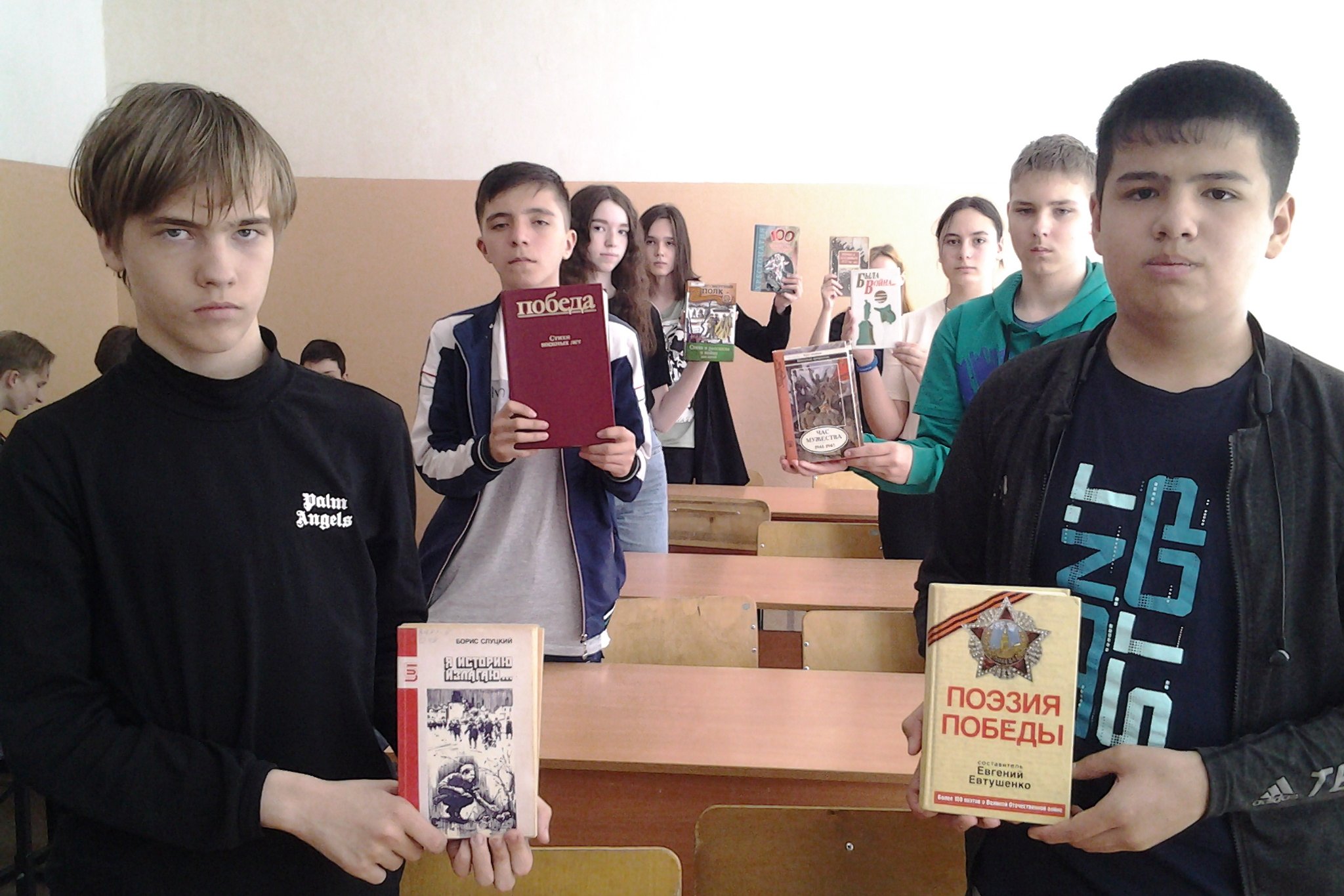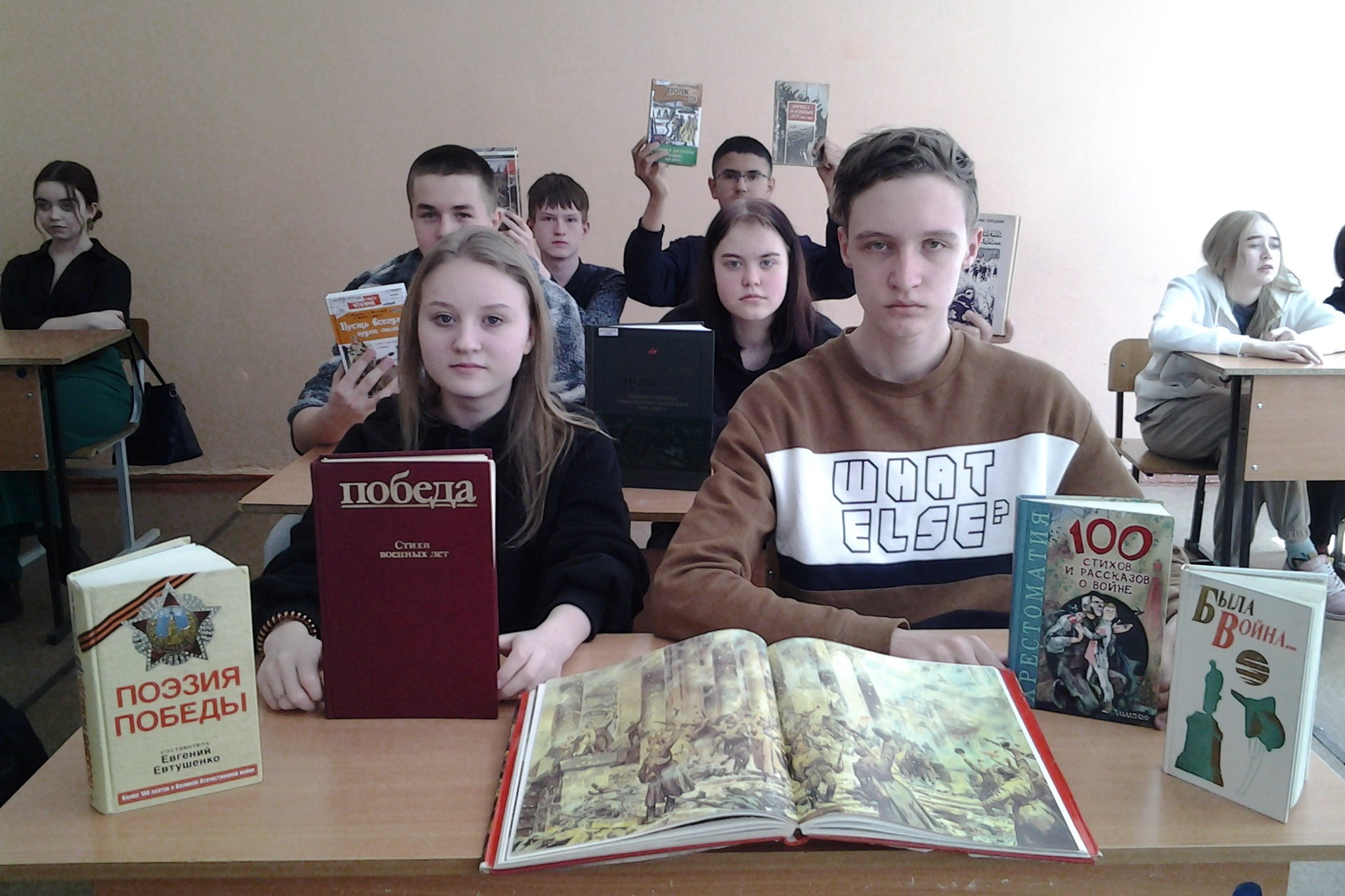 Затем школьникам было рассказано о книгах писателей-участников Великой Отечественной войны, о повестях «Сашки» и «Отпуск по ранению» Вячеслава Кондратьева, об «Альпийской балладе» Василя Быкова. Как демонстрация мрака и ужаса, которые не должны повториться, была вспомнена «Хатынская повесть» Алеся Адамовича, о тяжестях и горе войны «Жестокое милосердие» Юрия Мушкетика. В конце аудитория слушала стихи Анатолия Аквилева и Максима Танка, не только описывавших войну, но и последствия ее для людей в послевоенные годы.