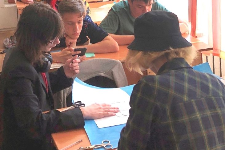 В заключение ребята выполнили творческое задание: создать плакат, который бы отразил впечатления и размышления, полученные в ходе занятия. На основе обсуждения, родилась оригинальная идея, воплощение которой увидят ученики всей школы: памятник героям Великой Отечественной, который, кажется, возникает в лазурном небе среди облаков, как и журавли, парящие над ним.
