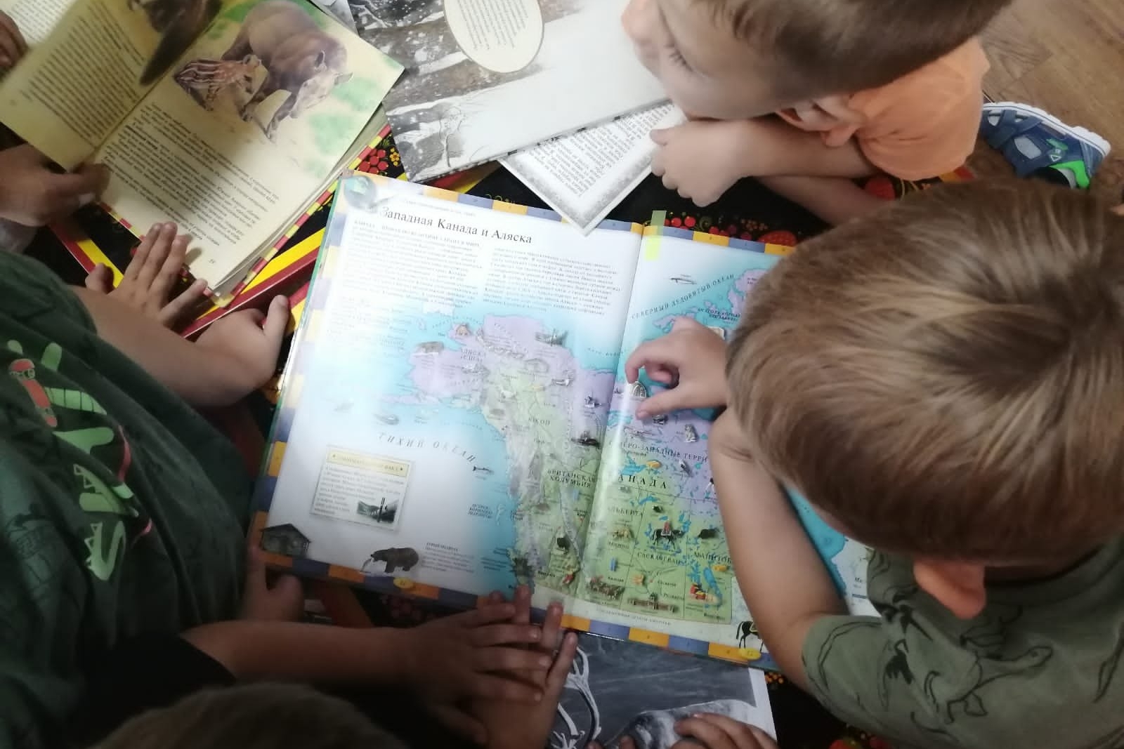Рассматривая яркие и красочные издания («Атлас животных», «Тайны живой природы», «Иллюстрированный атлас мира», «Дальний Восток», «Жизнь в тайге»), ребята узнали, в каких условиях проживают эти благородные животные, чем питаются, как их приручает и использует человек, и чем карибу отличаются от северных оленей России.