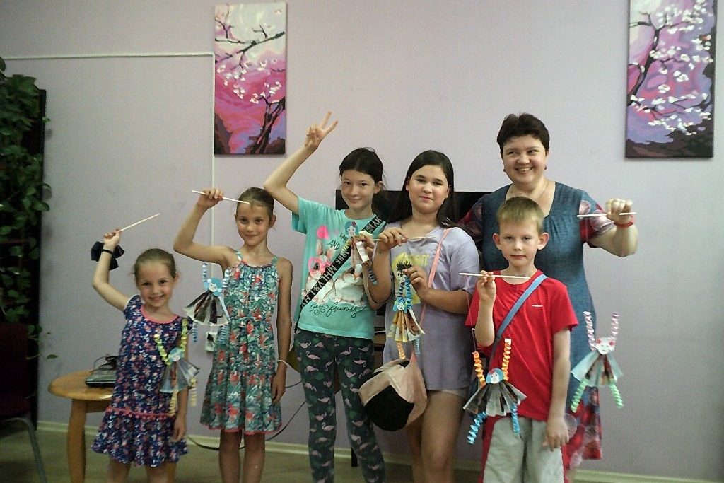 Поделка представляла собой конструирование из разных частей: платье, ручки, ножки, голова. Но сначала все эти части надо было изготовить методом плетения (руки и ноги) и собирания в гармошку (платье), а затем еще закрепить нитками готовую марионетку на деревянной палочке. Работа закипела. Изготавливали все по одному шаблону, но у всех куклы были непохожи друг на друга. Ребята расходились домой очень довольные, но сожалели, что больше мастер-классов летом не будет.