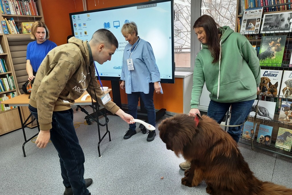 8 декабря в рамках декады инвалидов и социально-просветительского проекта социализации и адаптации обучающихся с ОВЗ в городском библиотечном пространстве «Тебя здесь ждут…» совместно с реализацией мероприятий грантового проекта «Нам не все равно, мы рядом» в библиотеке № 20 прошел час познания «Я — ответственный собаковод» (канистерапия в библиотеке). В гости в библиотеку приехали ребята-старшеклассники КГОБУ «Владивостокская специальная (коррекционная) общеобразовательная школа».