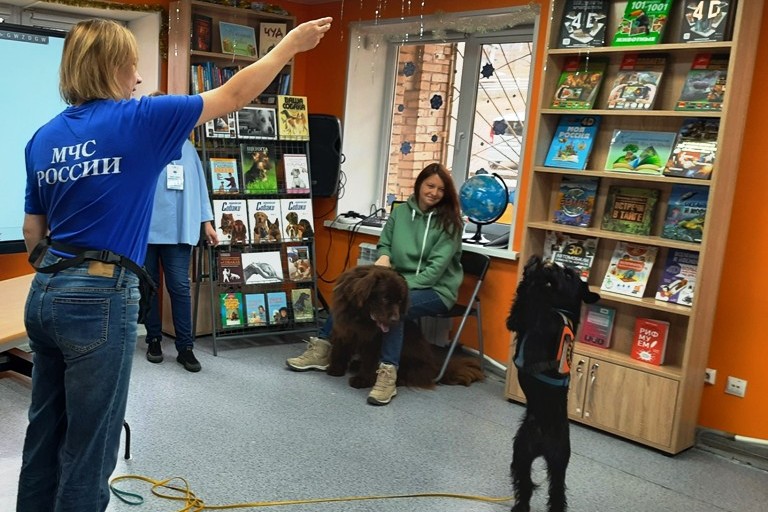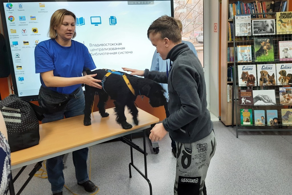 Вновь в библиотеку пришли Екатерина Валерьевна Воронцова – спасатель ПСП (кинологическое) Главного управления МЧС России по Приморскому краю, кинолог, зоопсихолог, специалист по поведению собак и миттельшнауцер Достояние Прикамья Вольт (4 года) и Екатерина Евгеньевна Волкова, Директор Автономной некоммерческой организации поддержки и развития семьи, детей и подростков «Дальневосточный центр психологии и экспертизы» (АНО «ДВЦПЭ»), психолог, детский психолог, преподаватель кафедры общепсихологических дисциплин ФГБОУ ВО ТГМУ Минздрава России; обучающий психотерапевт АОРС КИП, действительный член Межрегиональной общественной организации содействия развитию символдрамы и ее питомец — ньюфаундленд Зевс (1 год).
