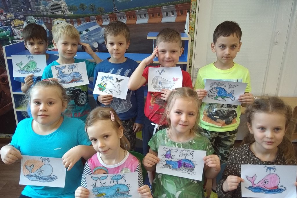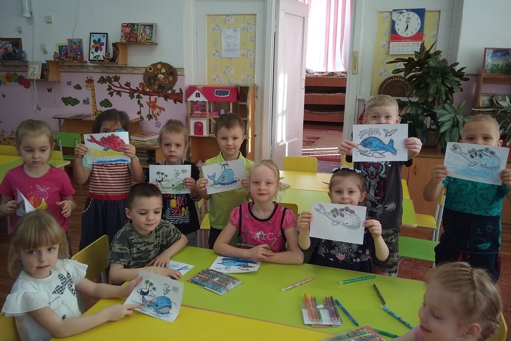 Дети старшей группы во второй части мероприятия, под повтор звуков, издаваемых китами, увлечённо принялись за раскраску картинок, смело выбирая свою собственную цветовую гамму.