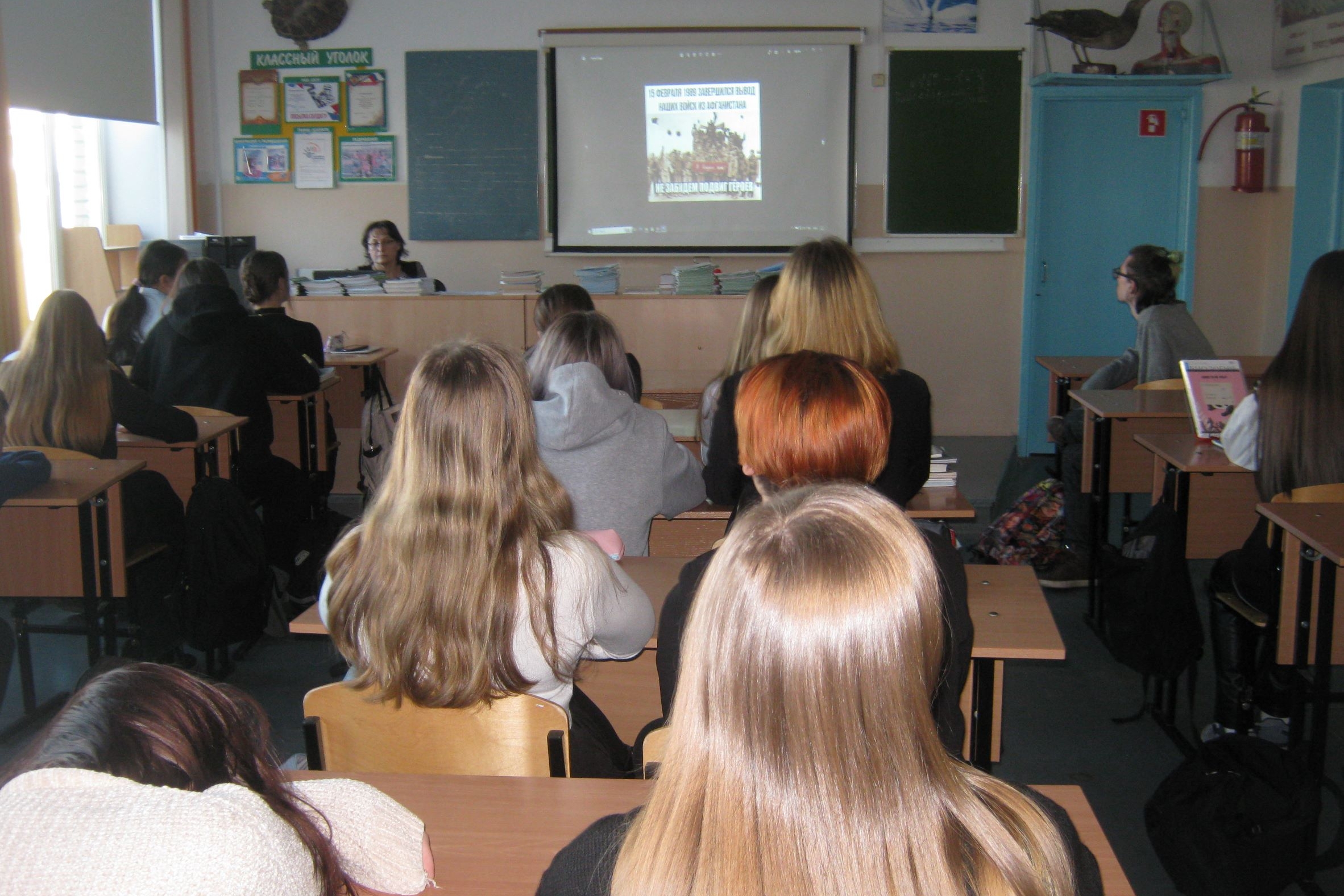 Школьникам рассказали о книгах, изданных в период 1986 – 1990 гг. Книга Геннадия Бочарова «Был и видел… (Афганистан, 1986 год)» рассказывает об армейских буднях советских солдат, о их не простой службе. О личном мужестве книга «Звезды подвига», о тех, кто был удостоен высокого звания Героя Советского Союза. Это и лейтенант Александр Демаков, который прикрывал отступление своих солдат «Передайте всем, погибаю как советский человек!». Ребята, выслушав сообщение, тут же соотнесли подвиг офицера тех лет, с подвигом недавних событий. Офицер – летчик Сергей Филиппов, погибший в Сирии, тоже герой, настоящий герой России, который не сдался в плен душманам, взорвал себя со словами «Это вам за пацанов!». Вспомнили и тех героев, кто спас Родину от фашизма и привели в пример подвиг Александра Матросова, закрывшего своей грудью вражеский дзот, поливавший солдат свинцовым дождем.